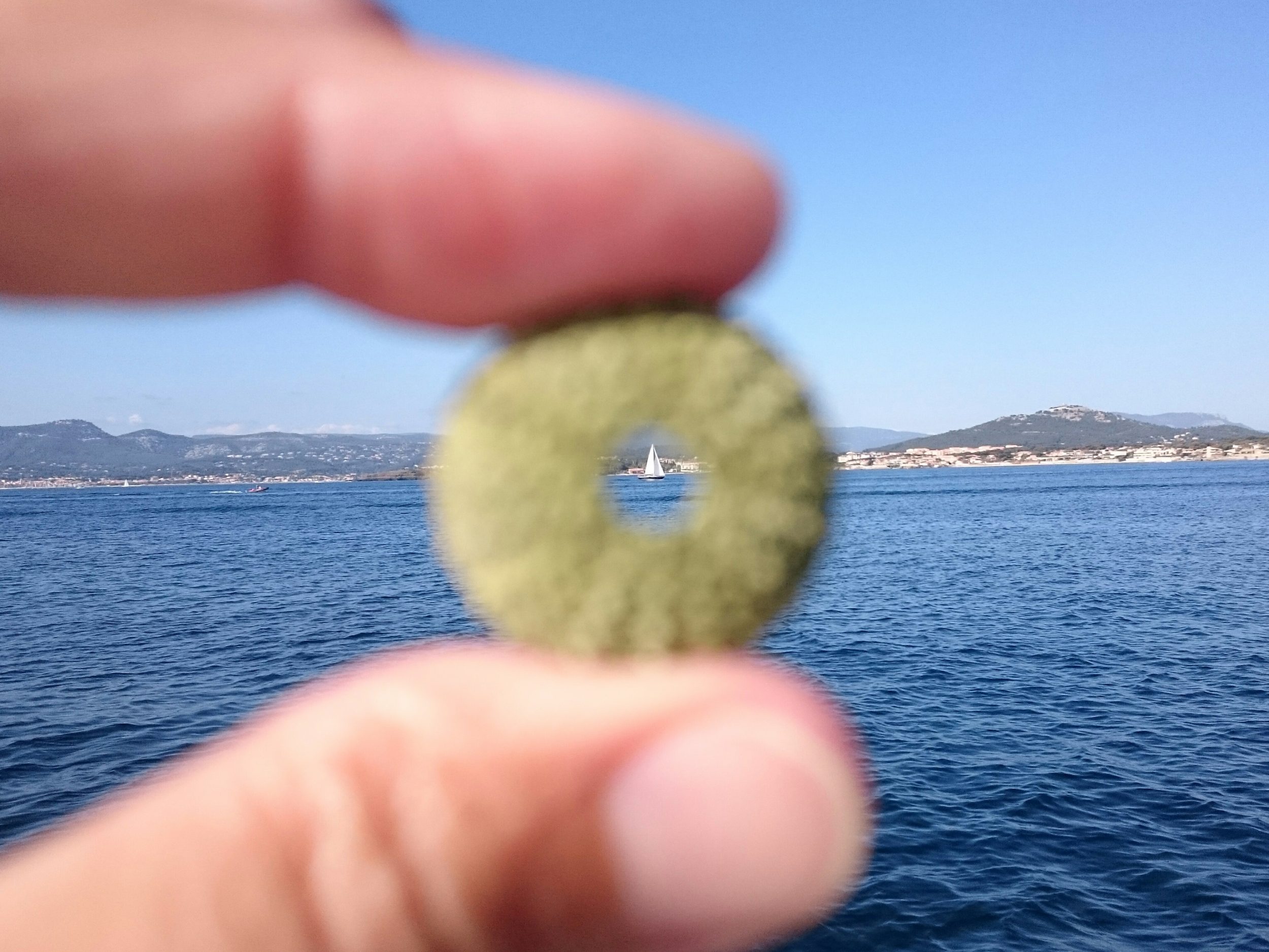 L’oeil de Sainte Lucie est l’opercule d’un coquillage (turbo) , en Corse l’œil de Saint Lucie est considéré comme porte-bonheur. J’en trouve parfois (rarement) sur la plage ou au fond de l’eau.