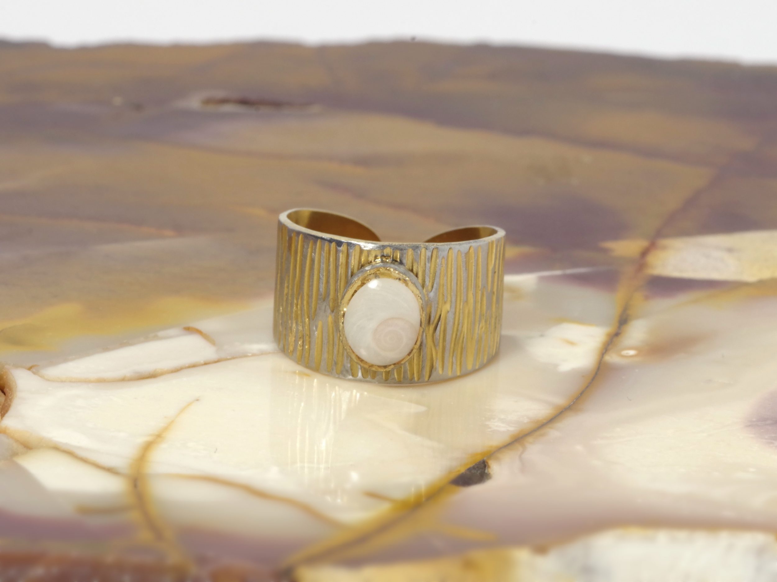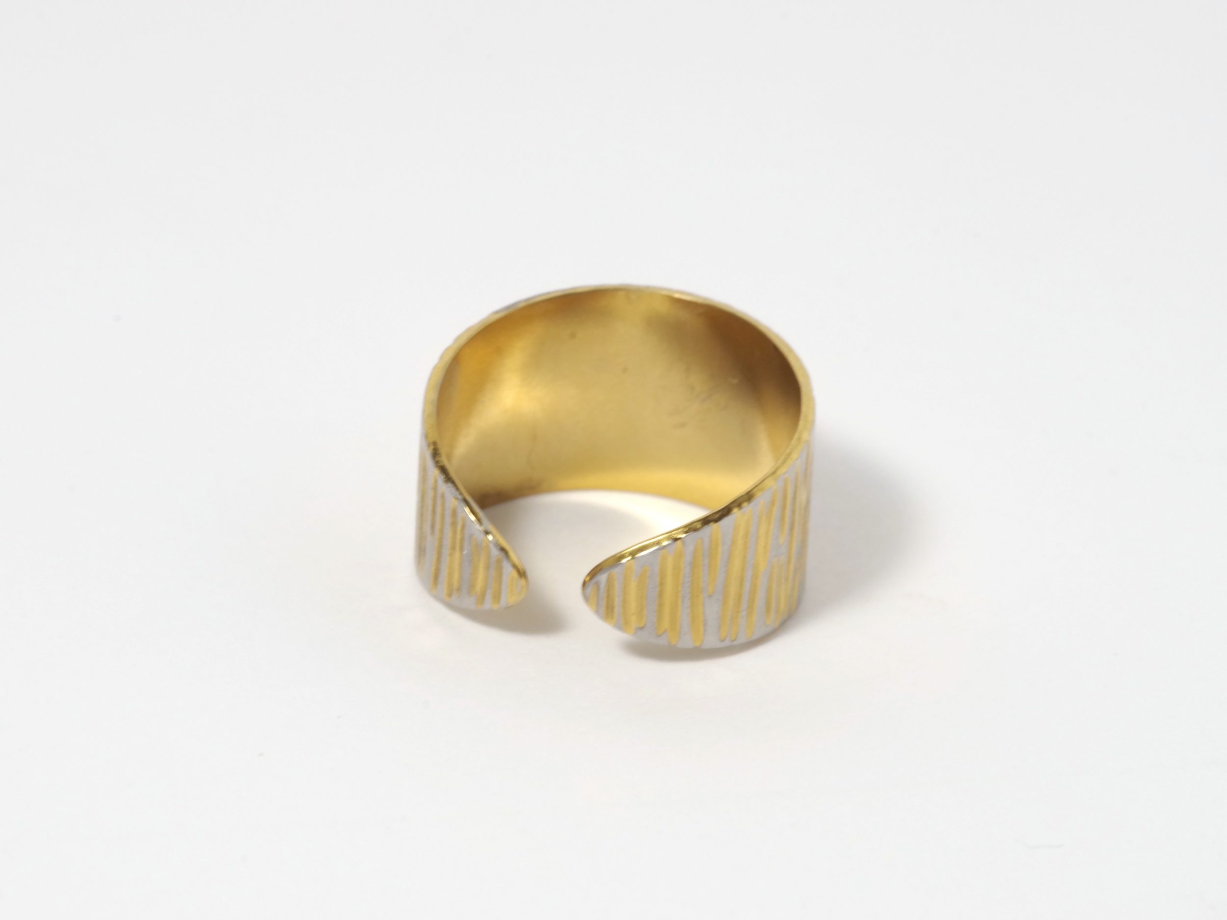 L’anneau de la bague, de très belle qualité est large avec un effet de texture zébrée, les creux sont dorés et les reliefs sont argentés.. N’étant pas fermé, il sera ajustable à votre doigt.