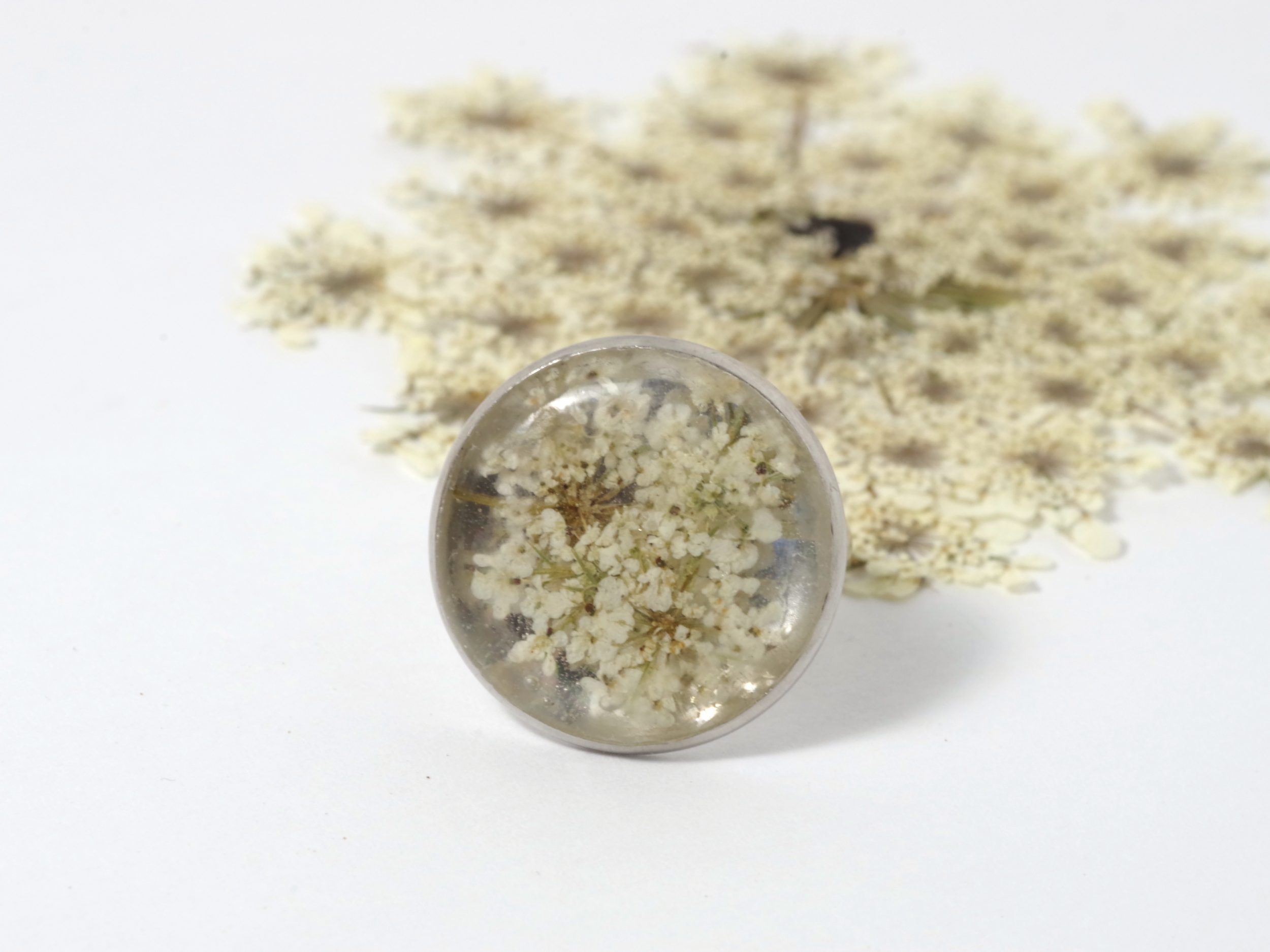 Bague à décor champêtre avec gros cabochon rond : des petites fleurs de carotte, banches, en inclusion dans de la résine. On voit le fond argenté à travers les fleurs. Anneau réglable en inox