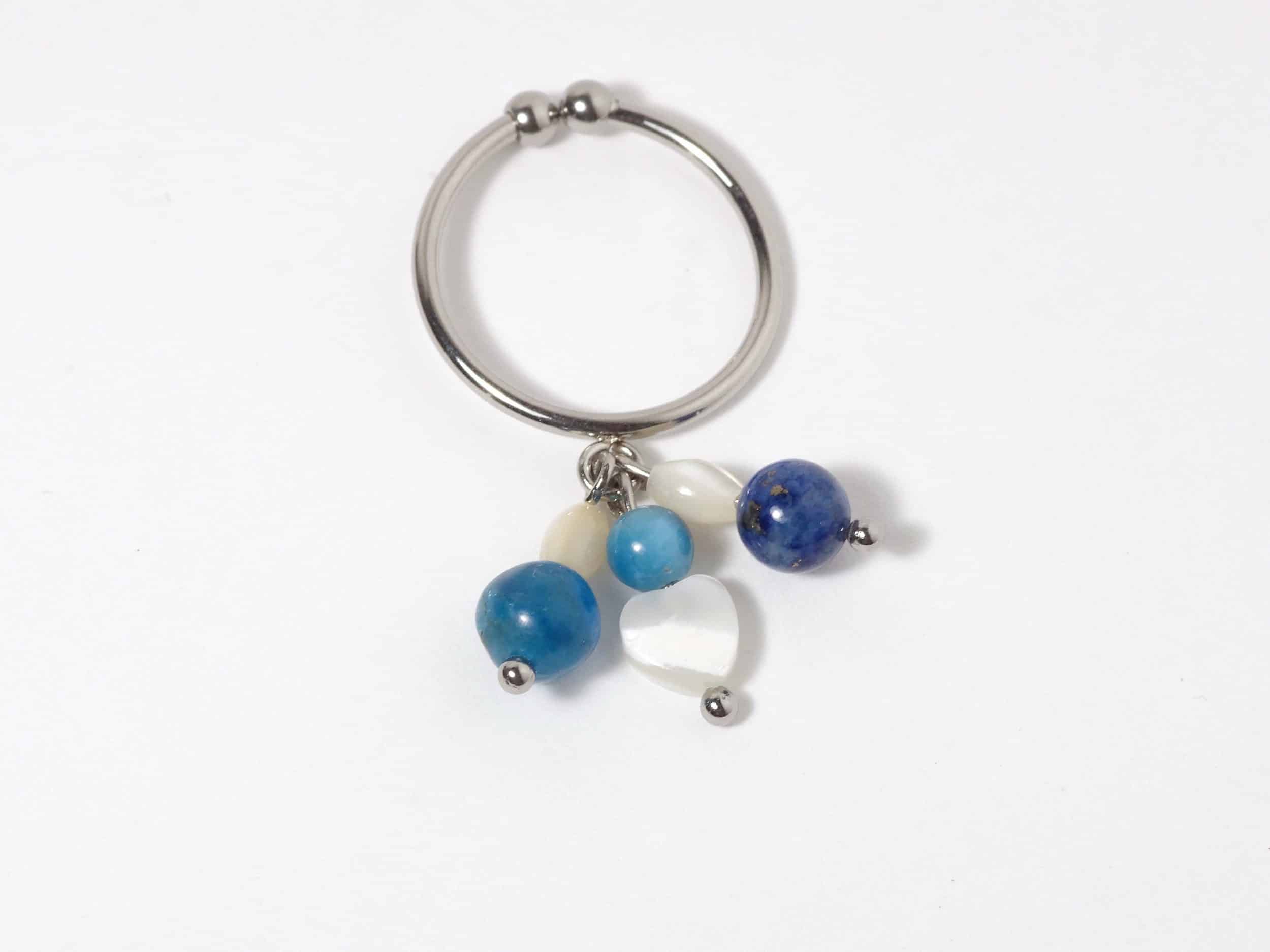 Ce bijou en inox et pierre est à la fois simple et féminin. Sur un fin anneau d’inox, trois petites breloques en gemmes bleues et blanches : lapis-lazuli (Les pierres sont montées sur une tige en inox).