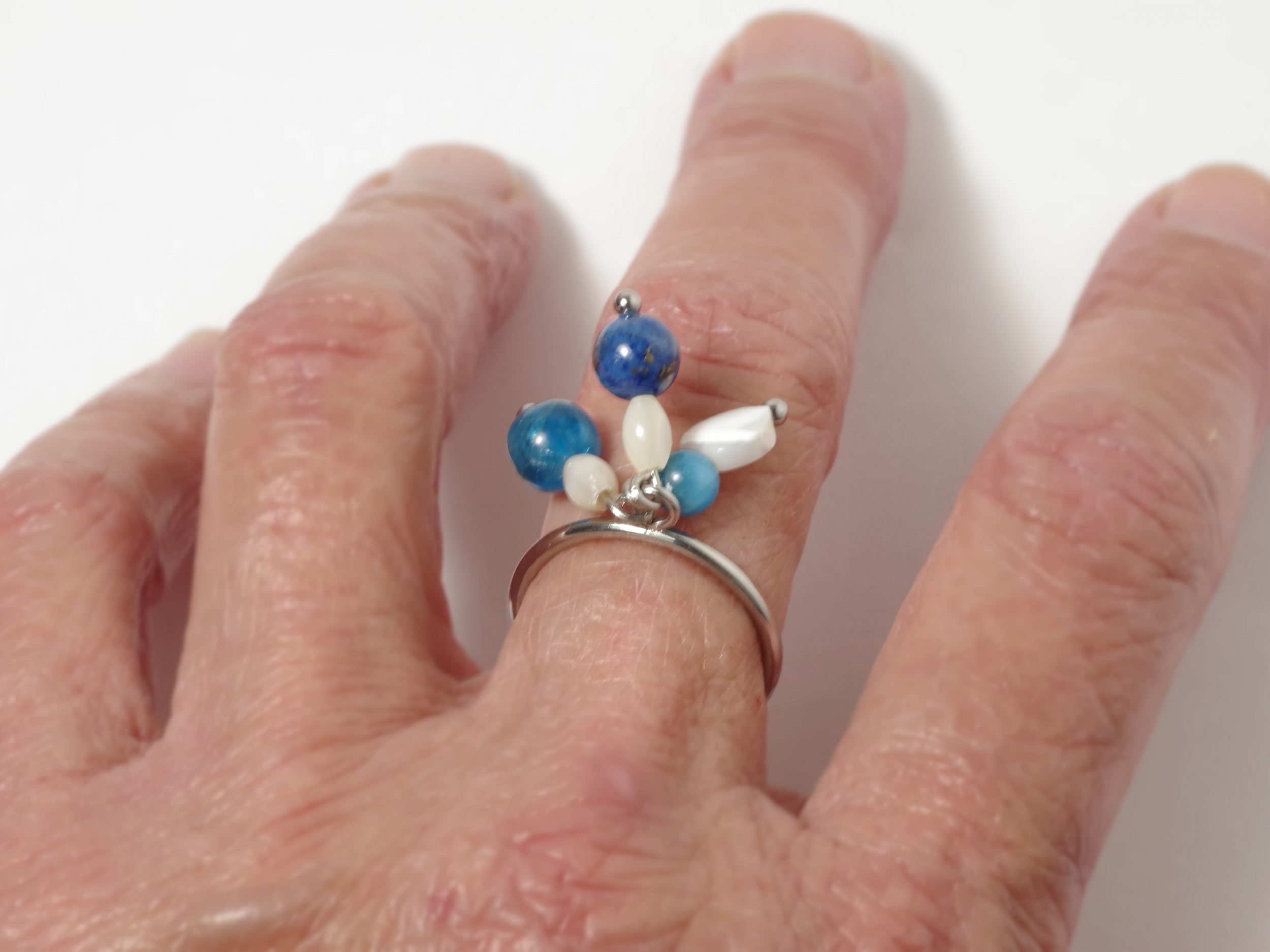 Cette bague est à la fois simple et féminine.  Elle associe anneau d’inox et gemmes bleues et blanches :  pierres apatite et lapis-lazuli, nacre blanche
