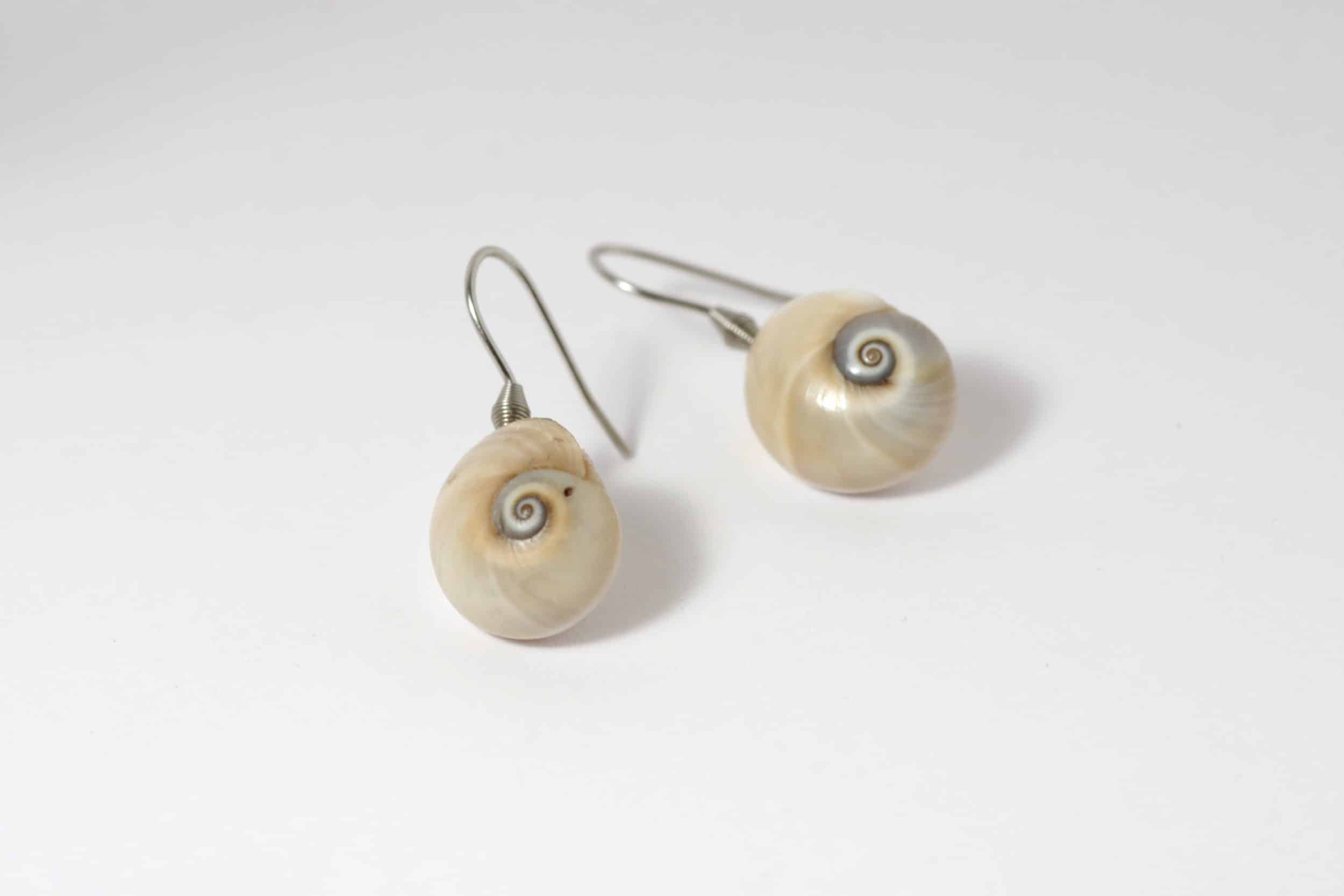 Les coquillages natices joséphines (neverita josephina) ont donné leur joli nom à plusieurs modèles de bijoux, colliers et boucles d’oreilles. La particularité de cette paire là est d’avoir une ligne plus foncée qui souligne le cœur de la spire. C’est une variante, ou une sous-espèce. Ces couleurs sont assez rares, n’y aura pas d’autres boucles d’oreilles de la même taille et de cette couleur là.