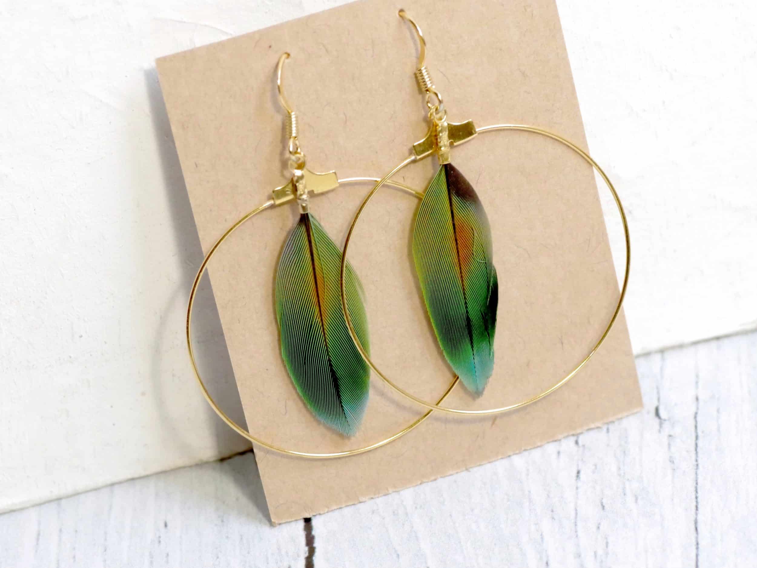 Boucles d’oreilles plumes de la collection Brussoise . Elles ont un grand anneau doré avec une plume verte avec un leger dégradé orange au centre.