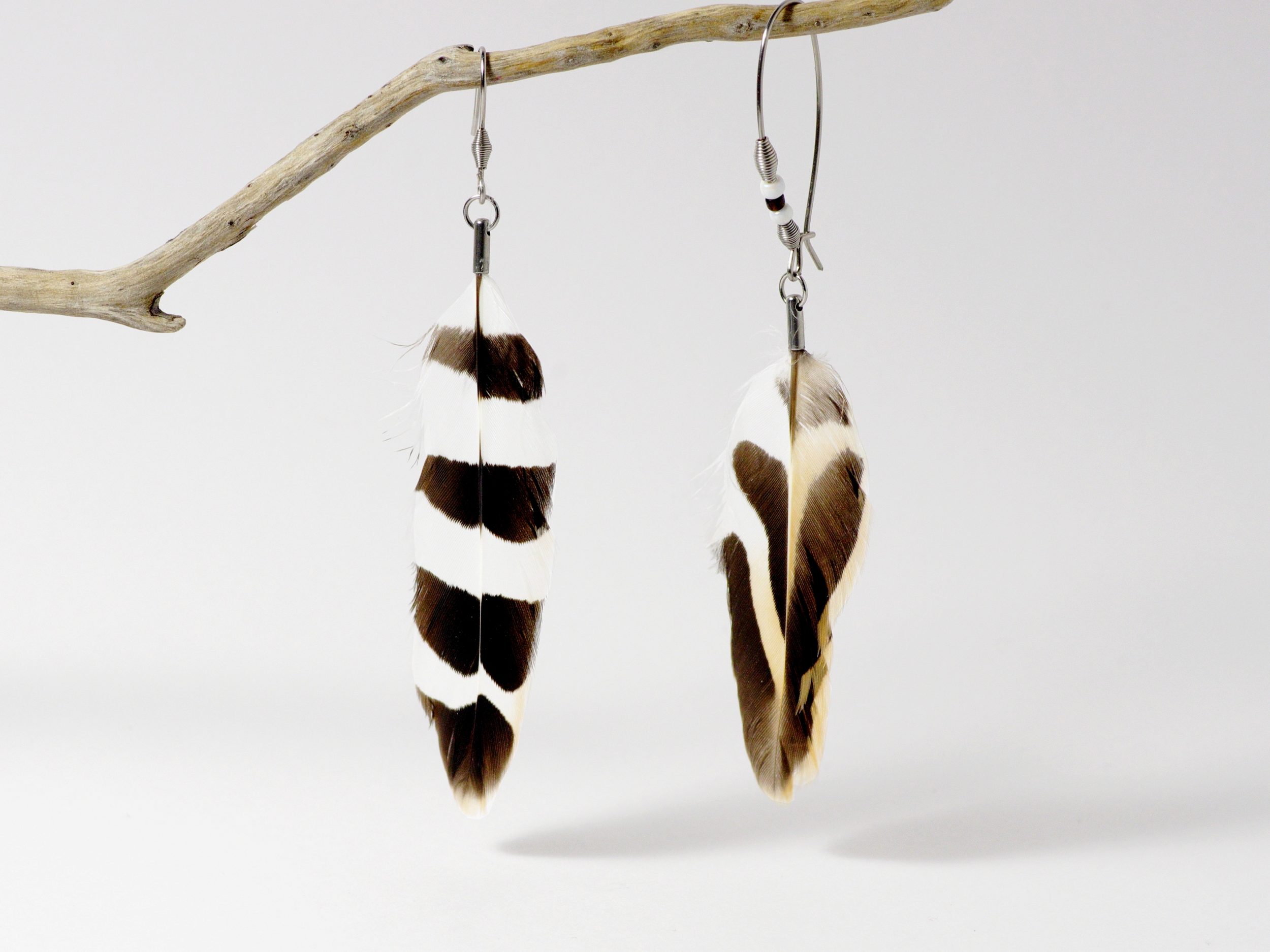 Boucles d’oreilles avec de grandes plumes  originales asymétriques, aux graphismes noirs blancs et beiges. Ce sont des plumes de huppe