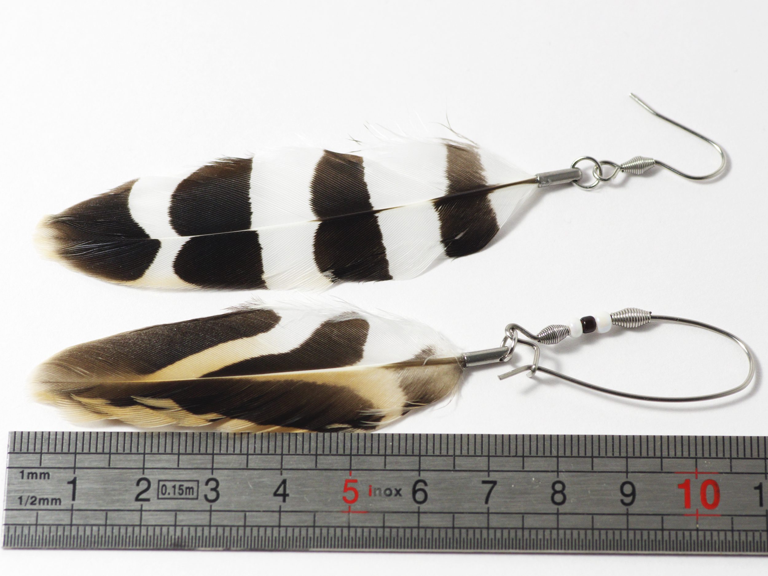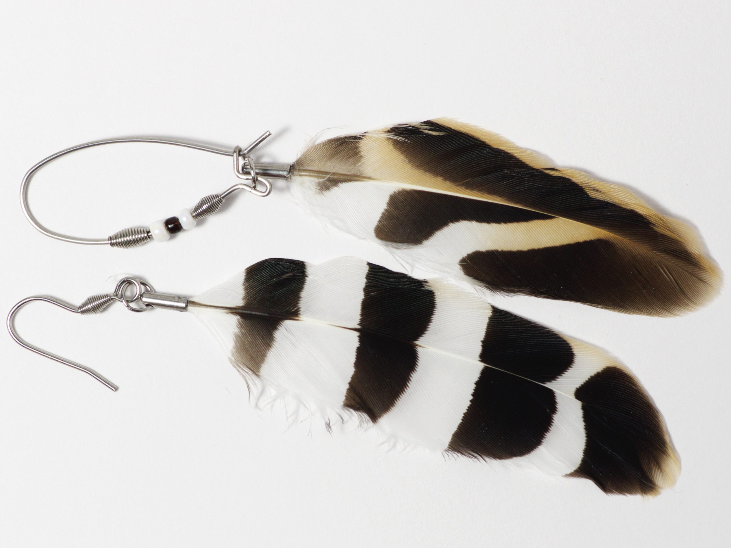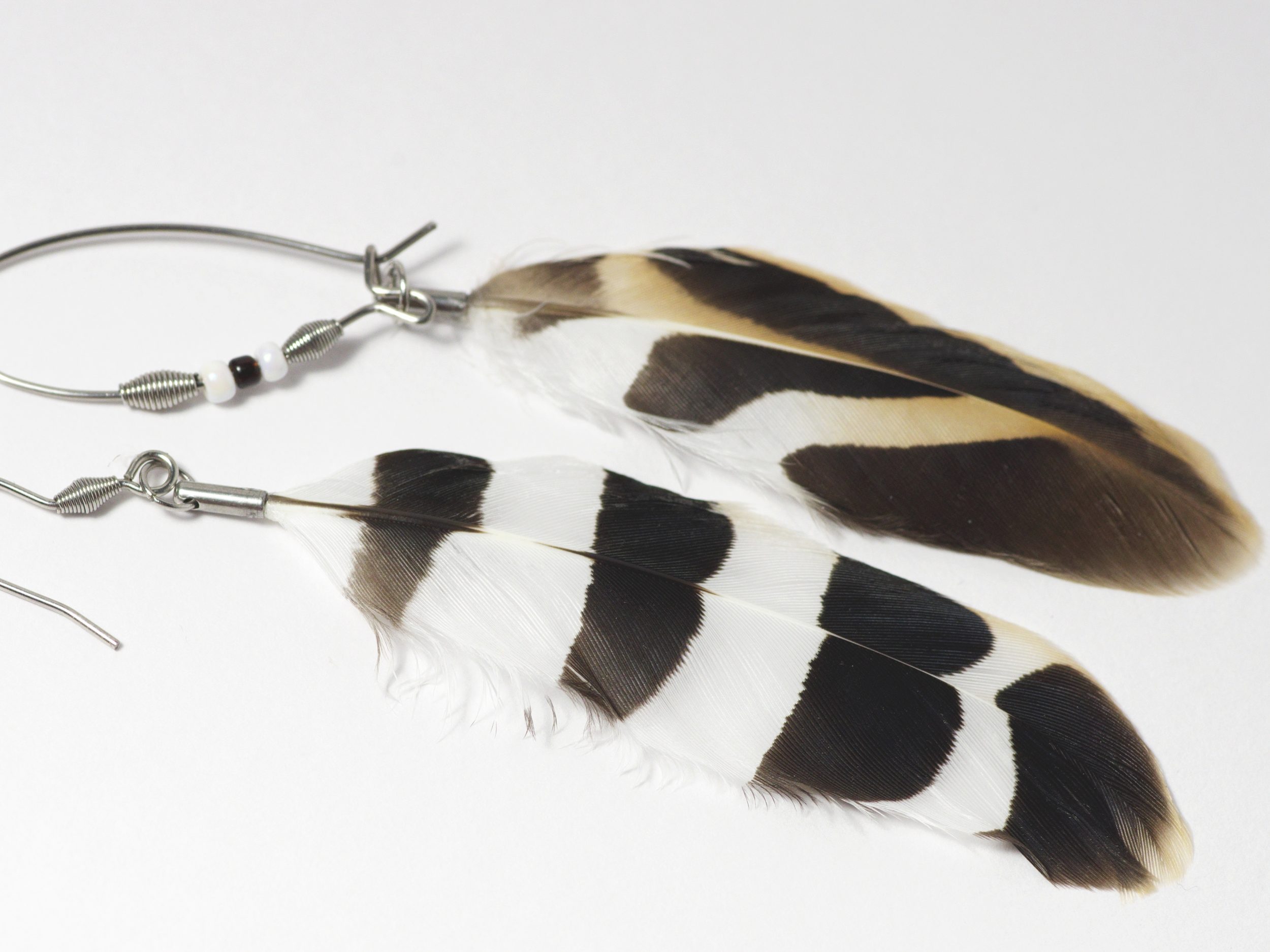Les crochets de cette paire sont différents pour compenser la taille des plumes : un crochet simple pour la plus grande plume, un long crochet décoré de perles pour l’autre plume. (perles de verre noires et blanches)