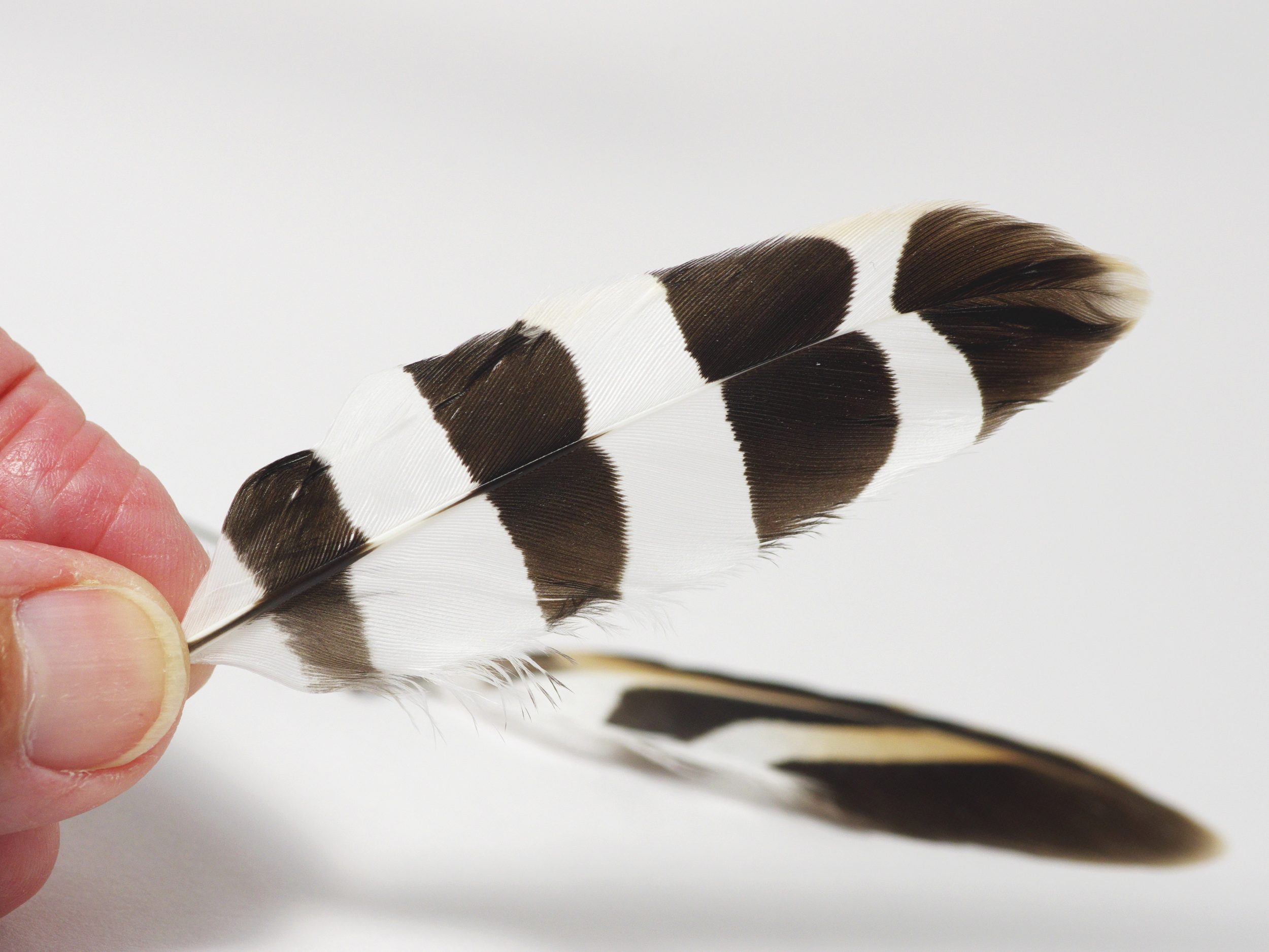 Ces grandes plumes asymétriques sont des plumes de huppe fasciée. Trouvées dans la nature en Provence. Les plumes tombent naturellement.