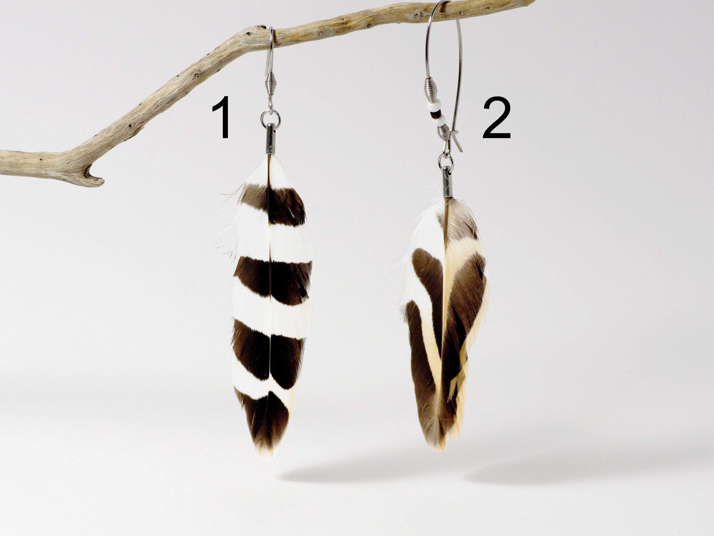 Ces grandes boucles d’oreilles asymétriques ont de belles et grandes plumes de huppe. Plumes naturelles, originales avec des graphismes noirs blancs et beiges.