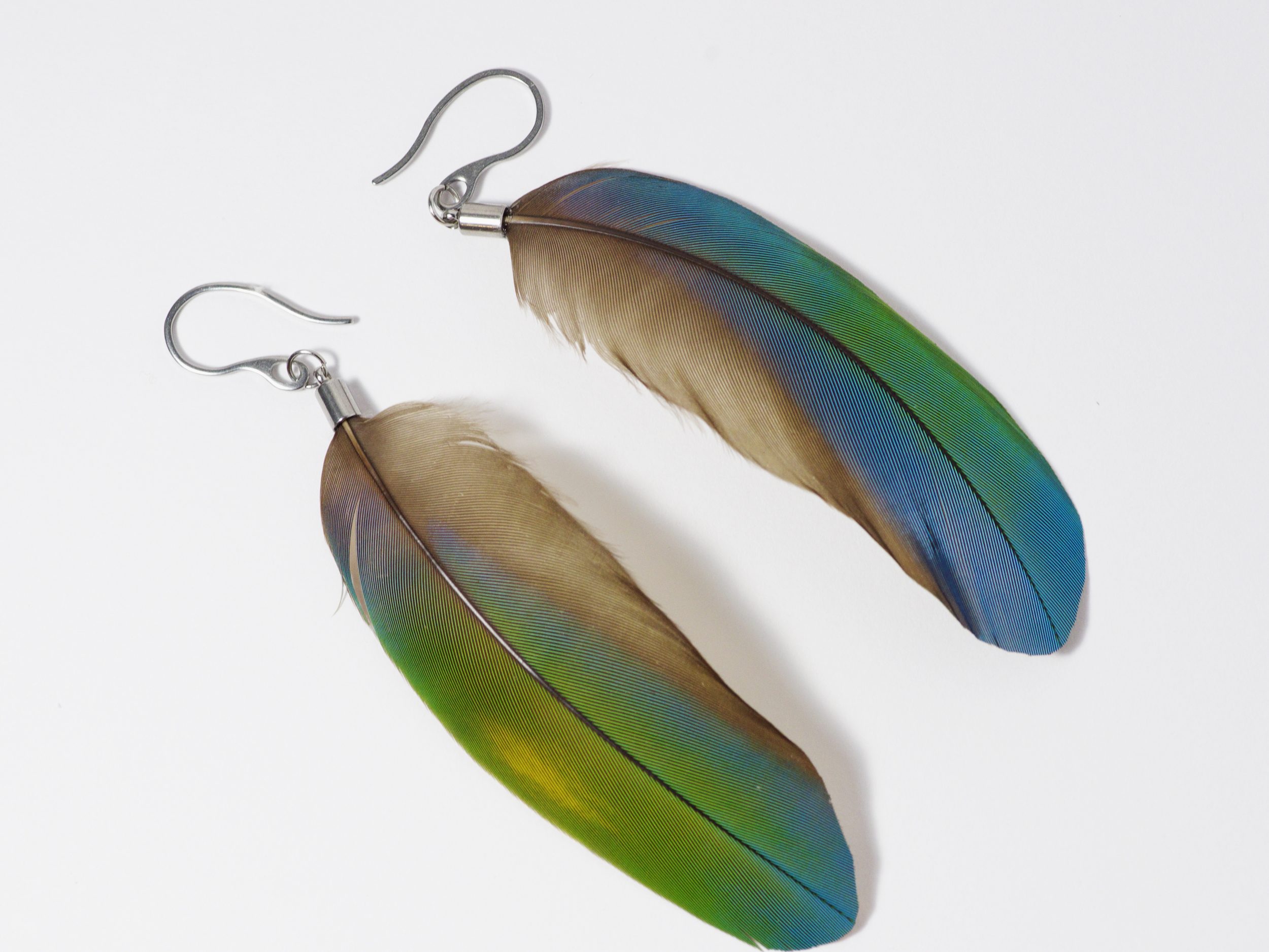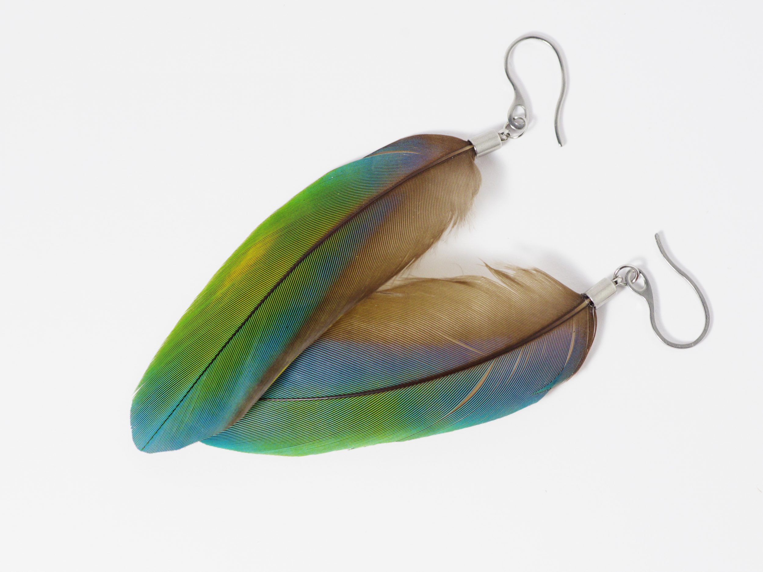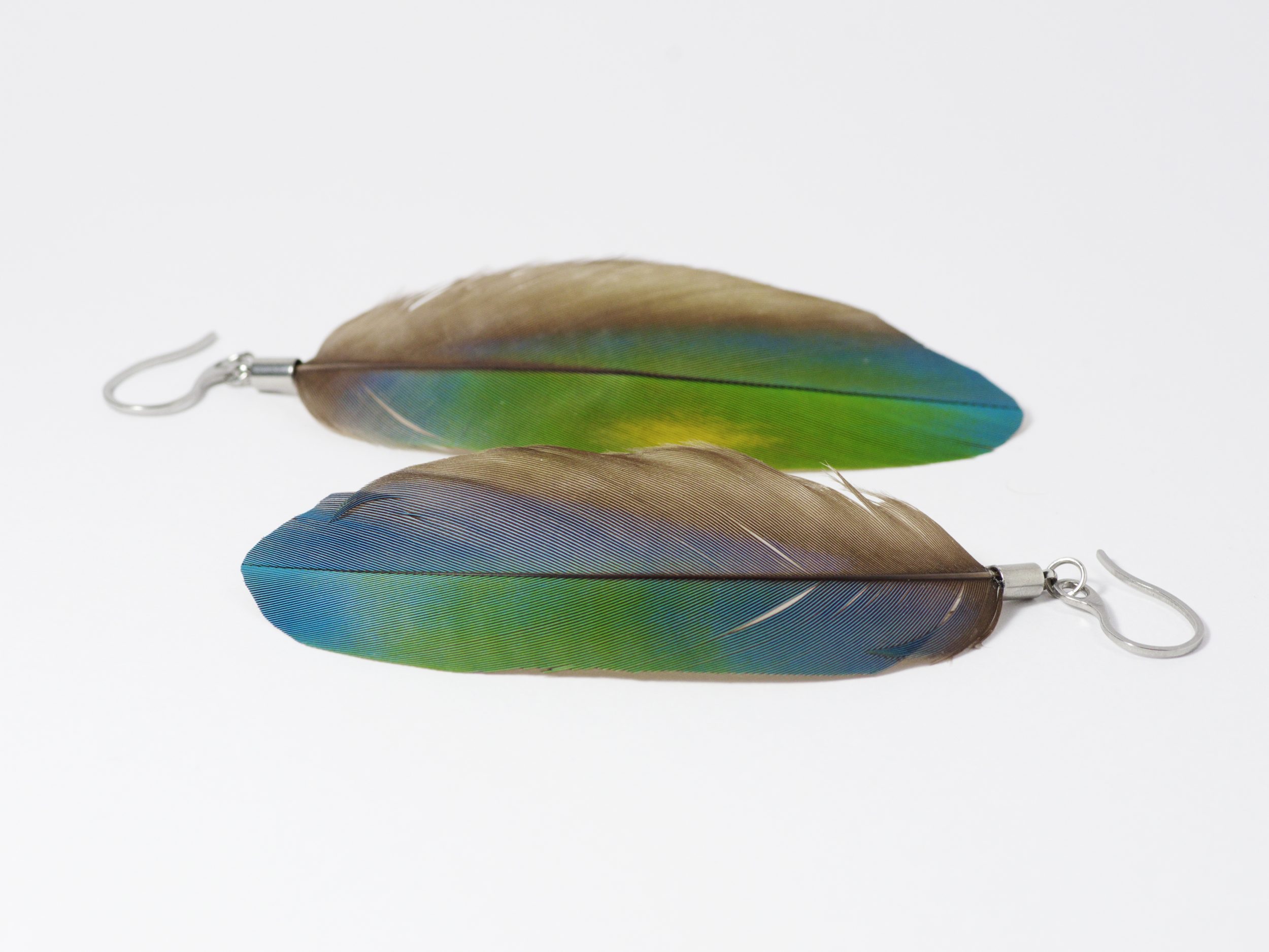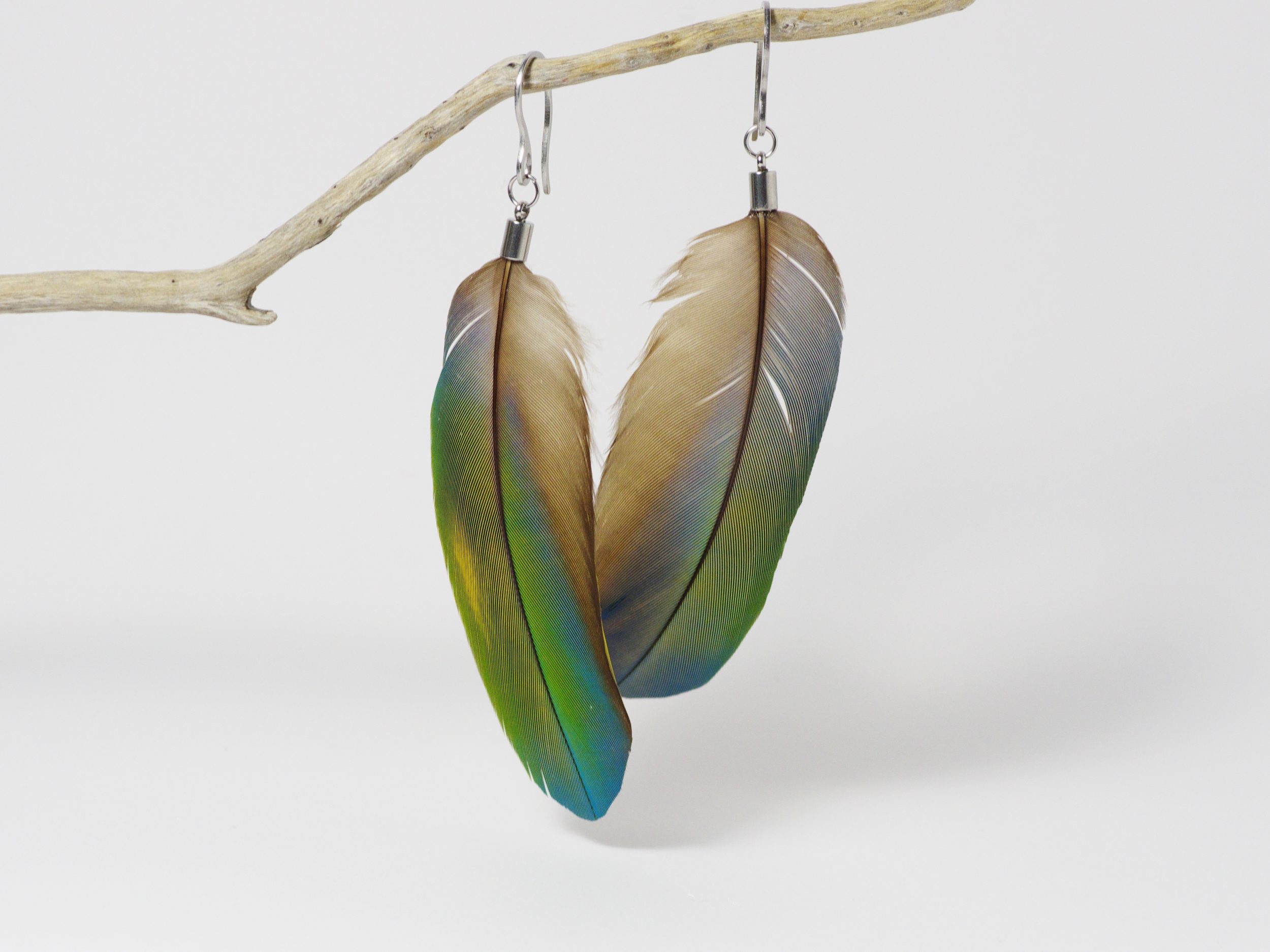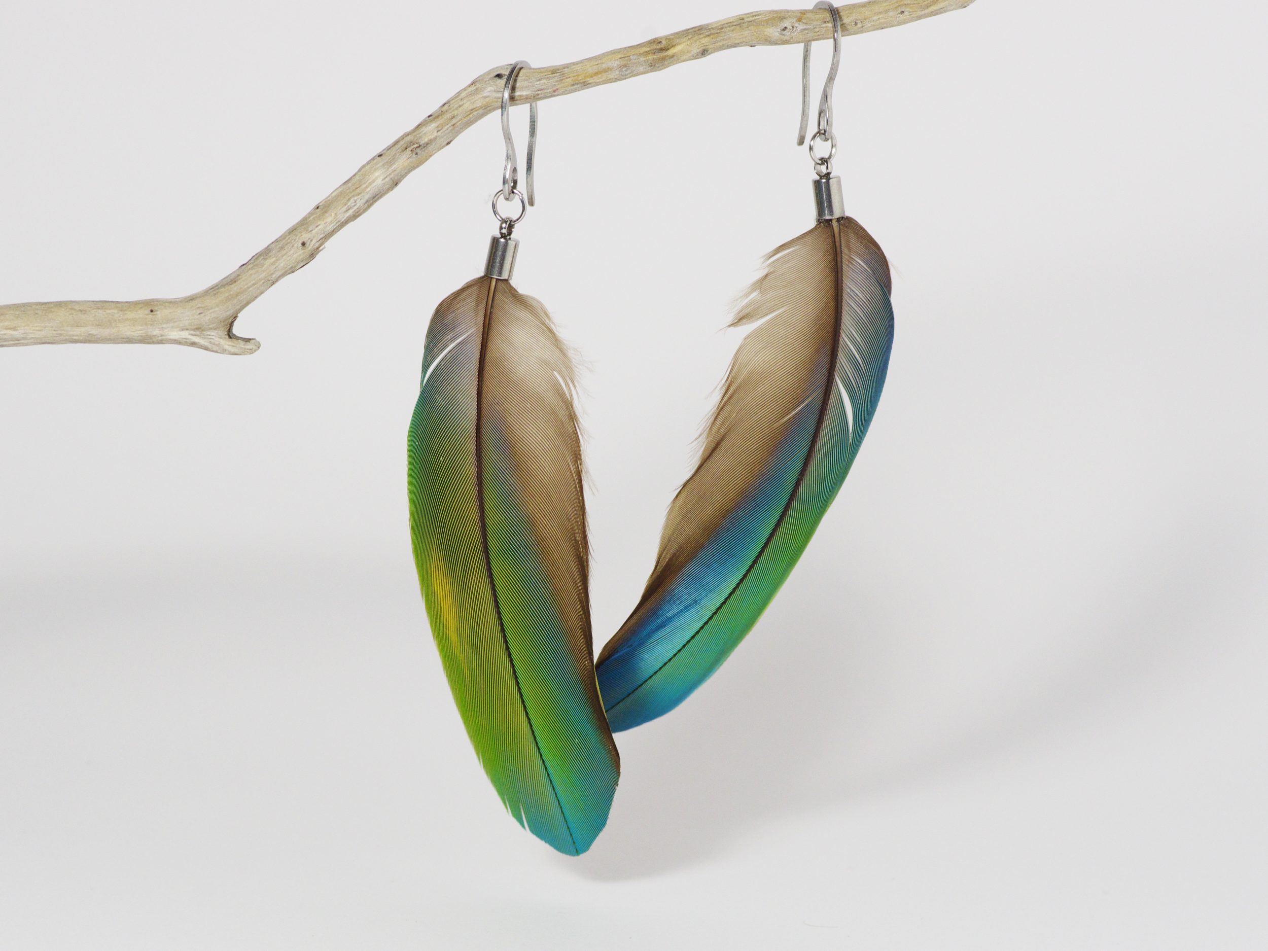 Boucles d’oreilles avec de belles et grandes plumes d’ara, dans des tons bleu-vert.