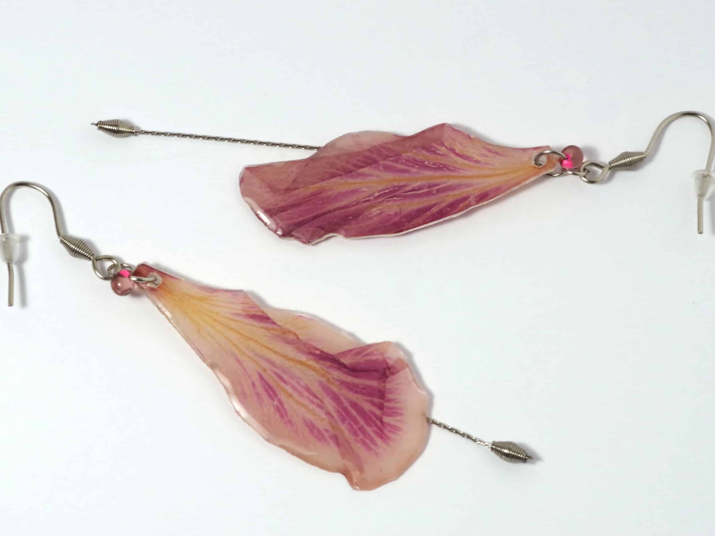 Ces boucles d’oreilles en vrais pétales et inox sont très belles avec leur forme dansante et leurs teintes délicates.