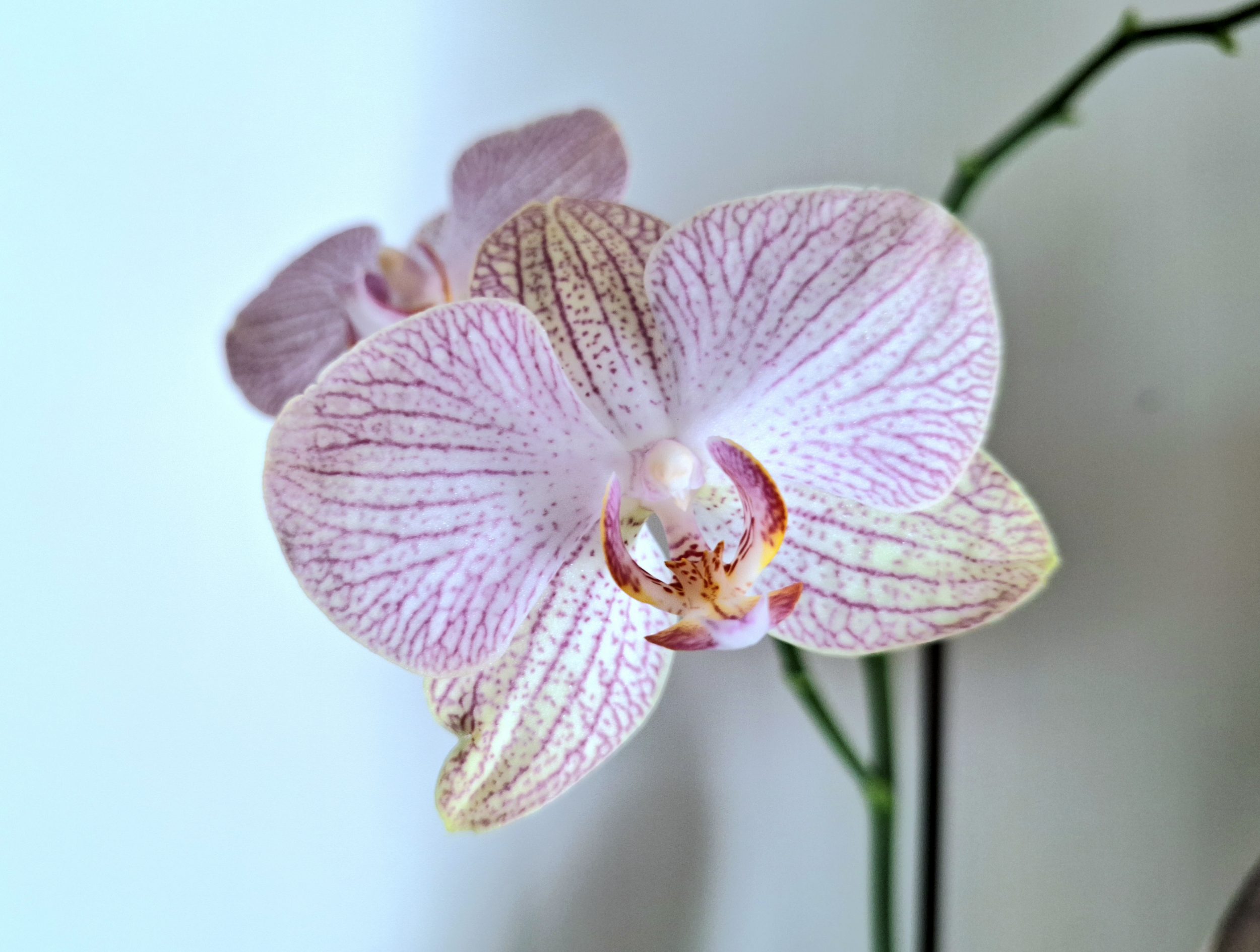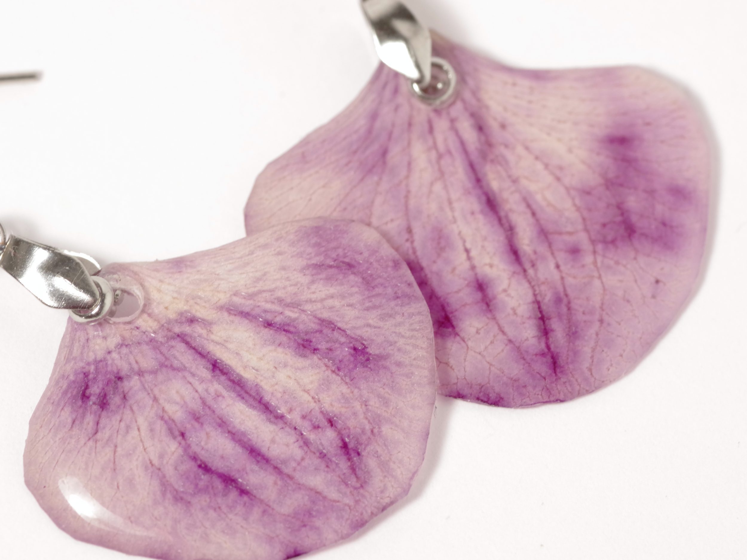 Les pétales sont violet clair avec un réseau violet plus foncé et plus vif. Les deux viennent de la même orchidée mais sont très légèrement différents en taille. Une fois aux oreilles la petite différence de taille ne se verra plus du tout.