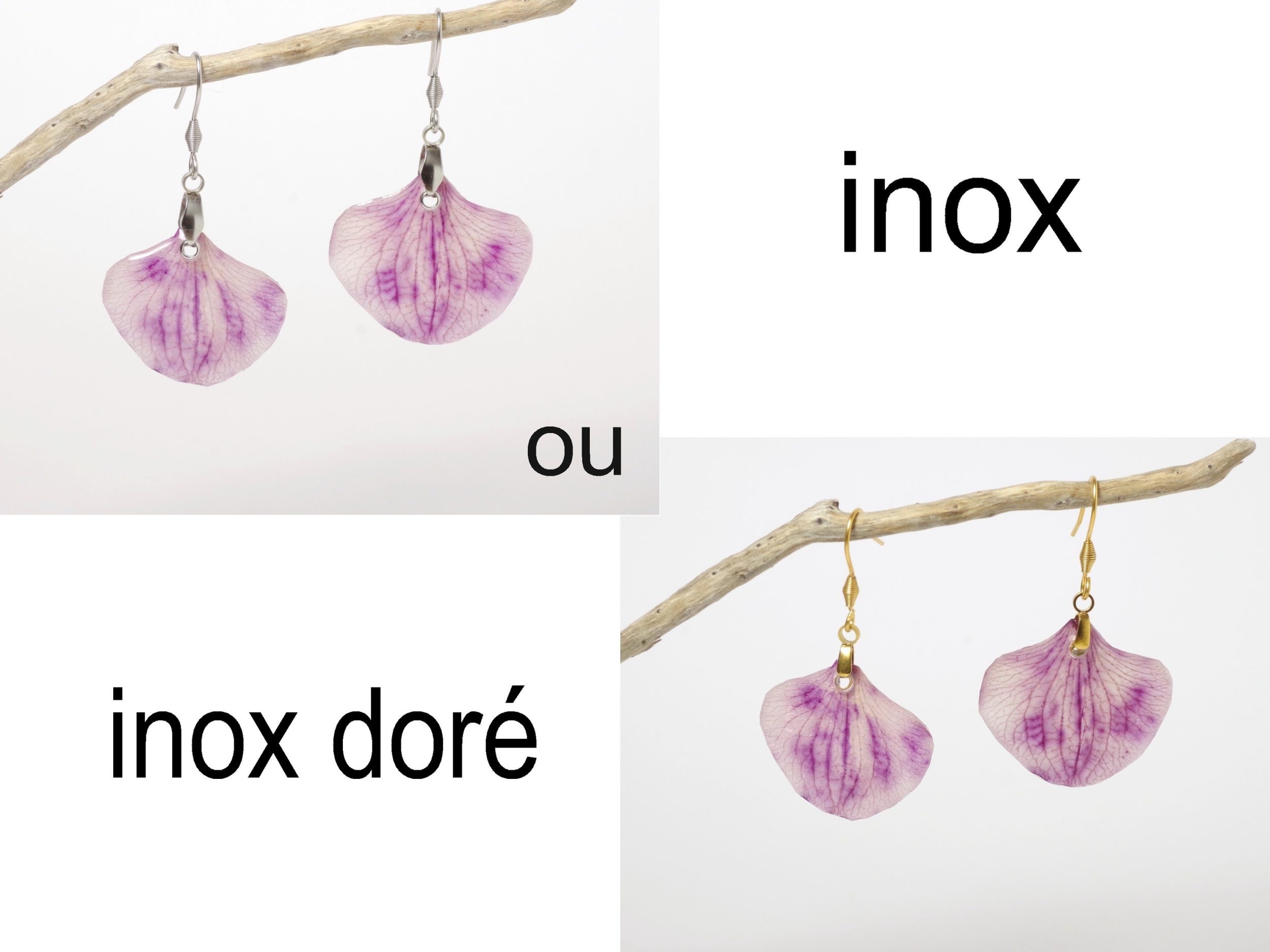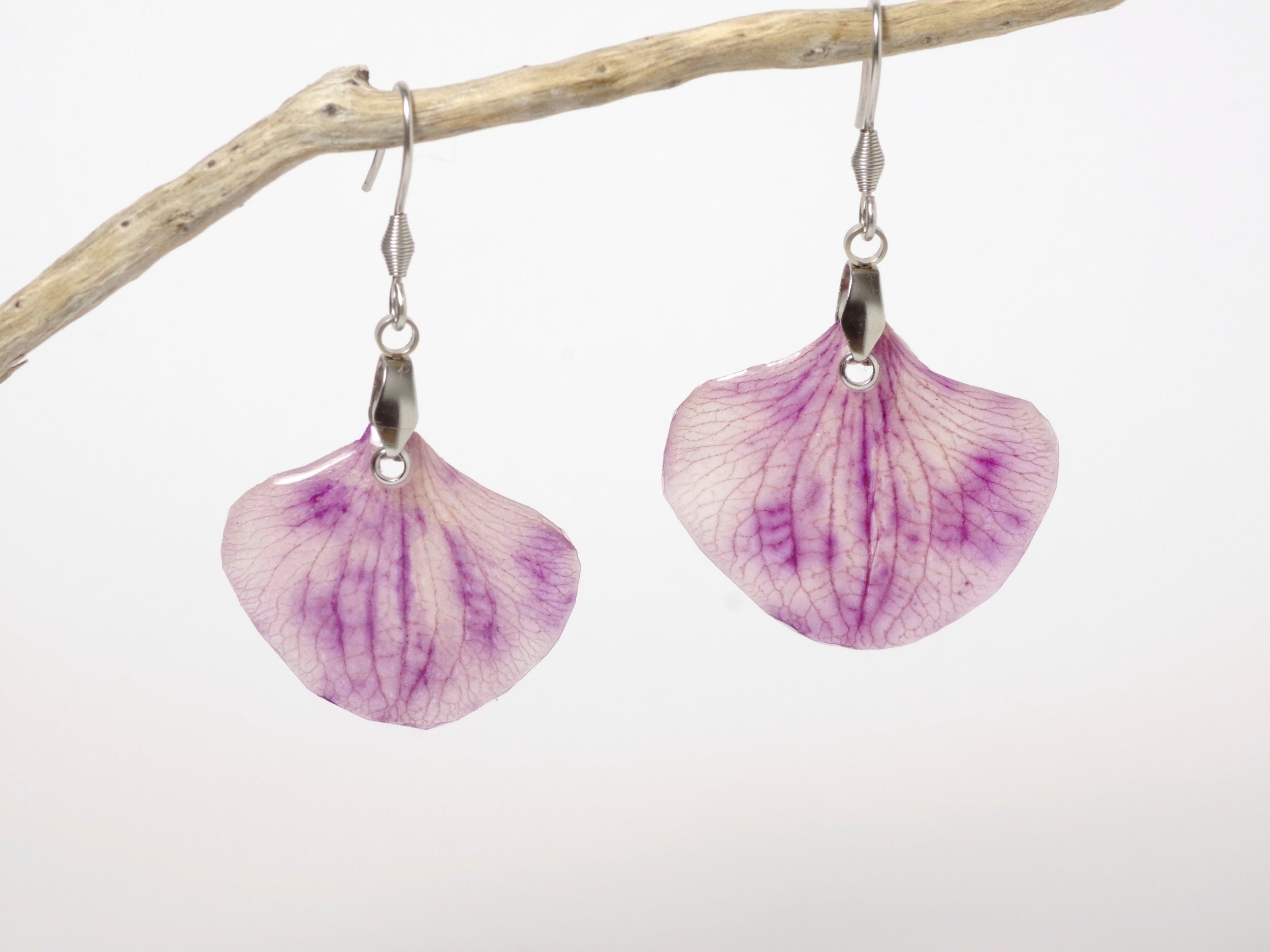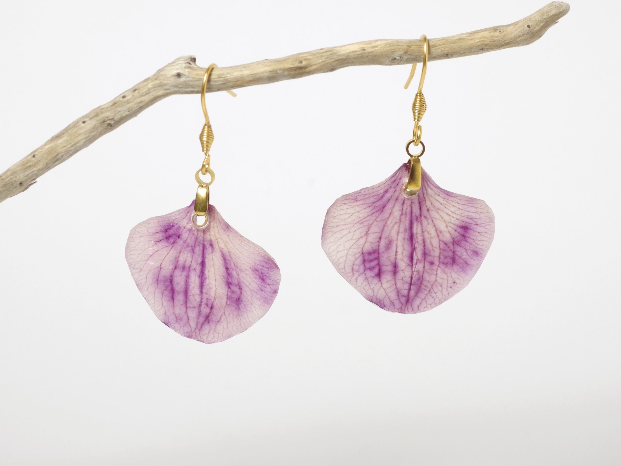 Ces boucles d’oreilles Elfine en pétales d’orchidée violette sont des pièces uniques.