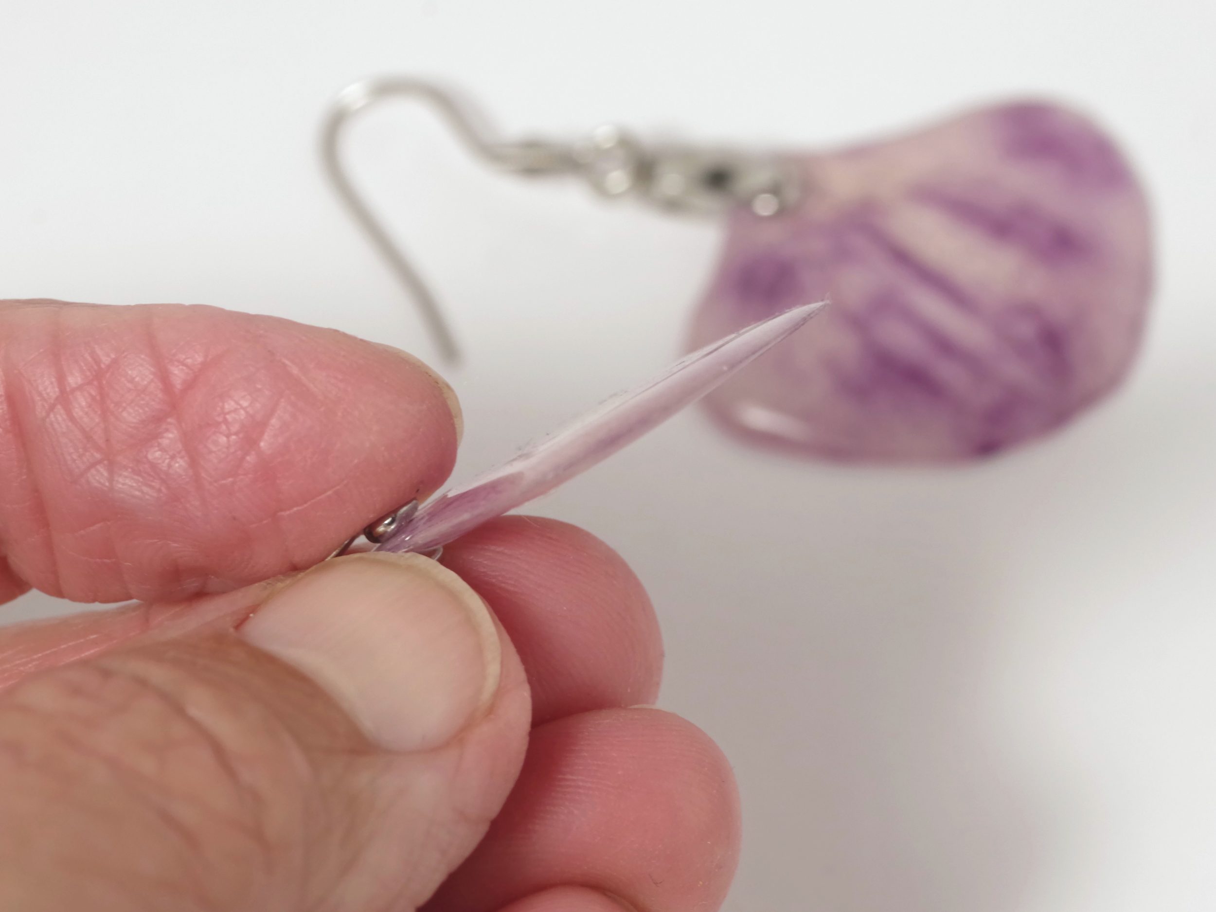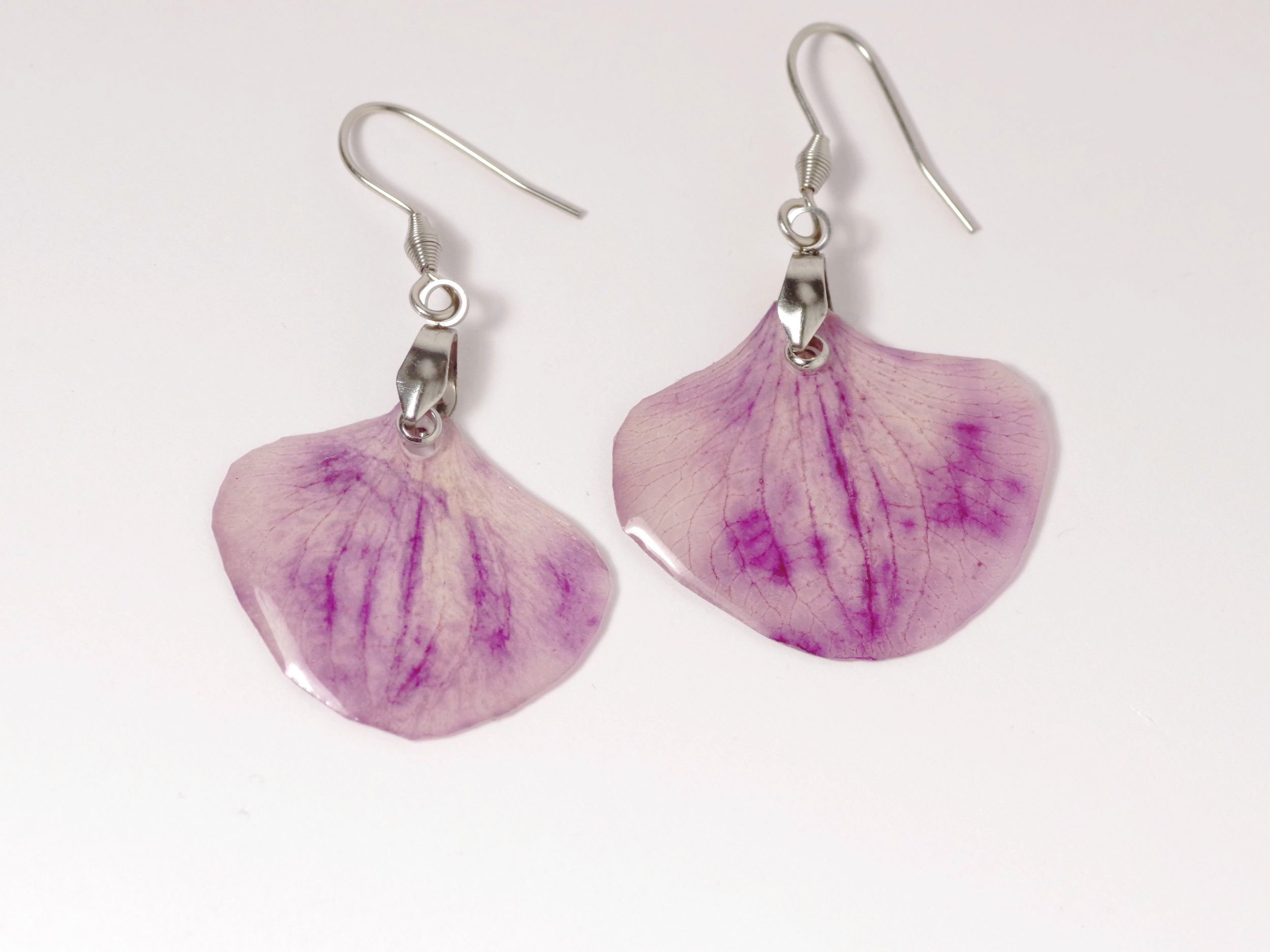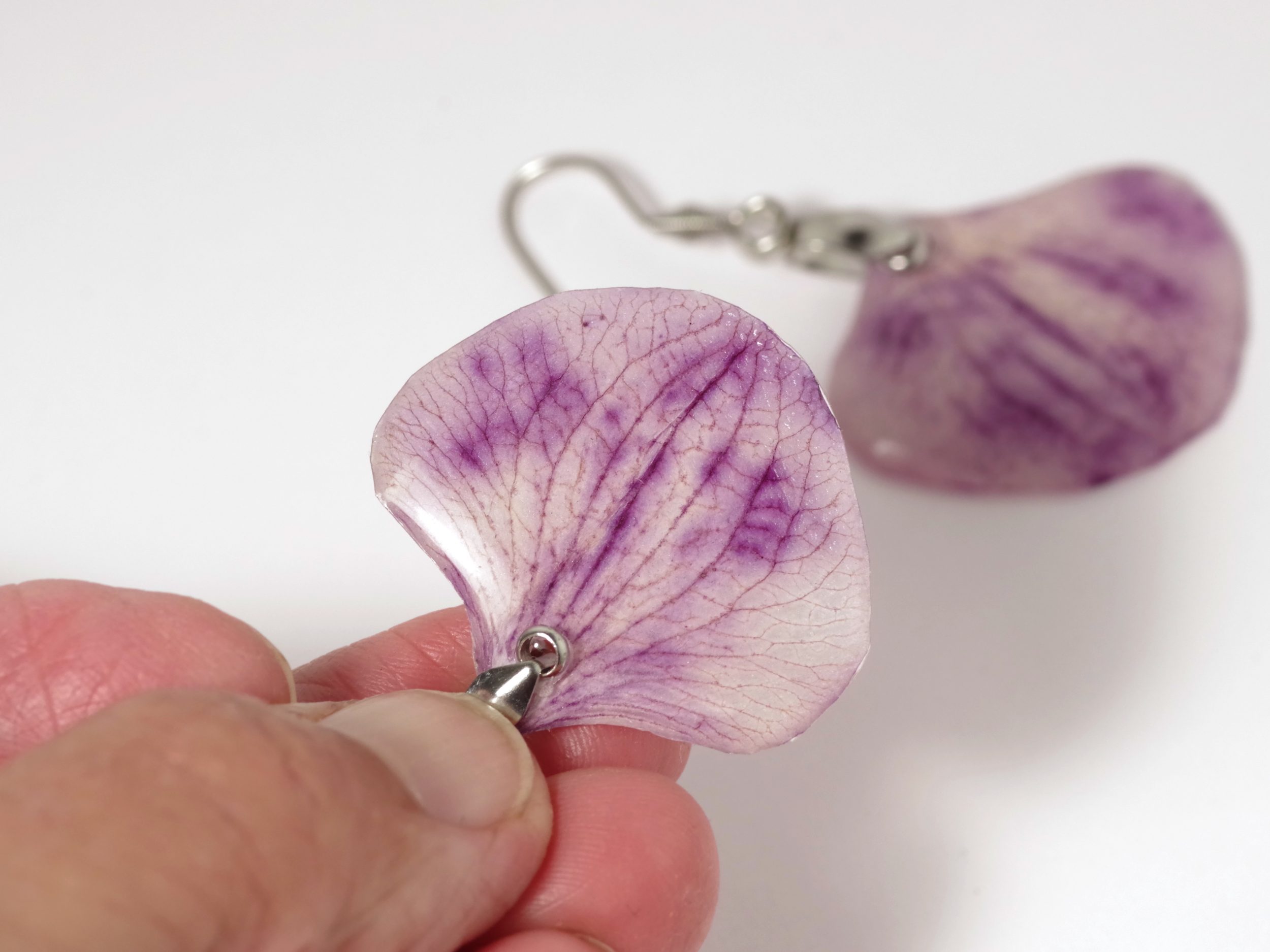 Pour créer ces pendentifs j’ai fait sécher sous presse des pétales d’une de mes orchidées. Puis Je les ai protégés avec une résine qui les rend très solides et laqués.