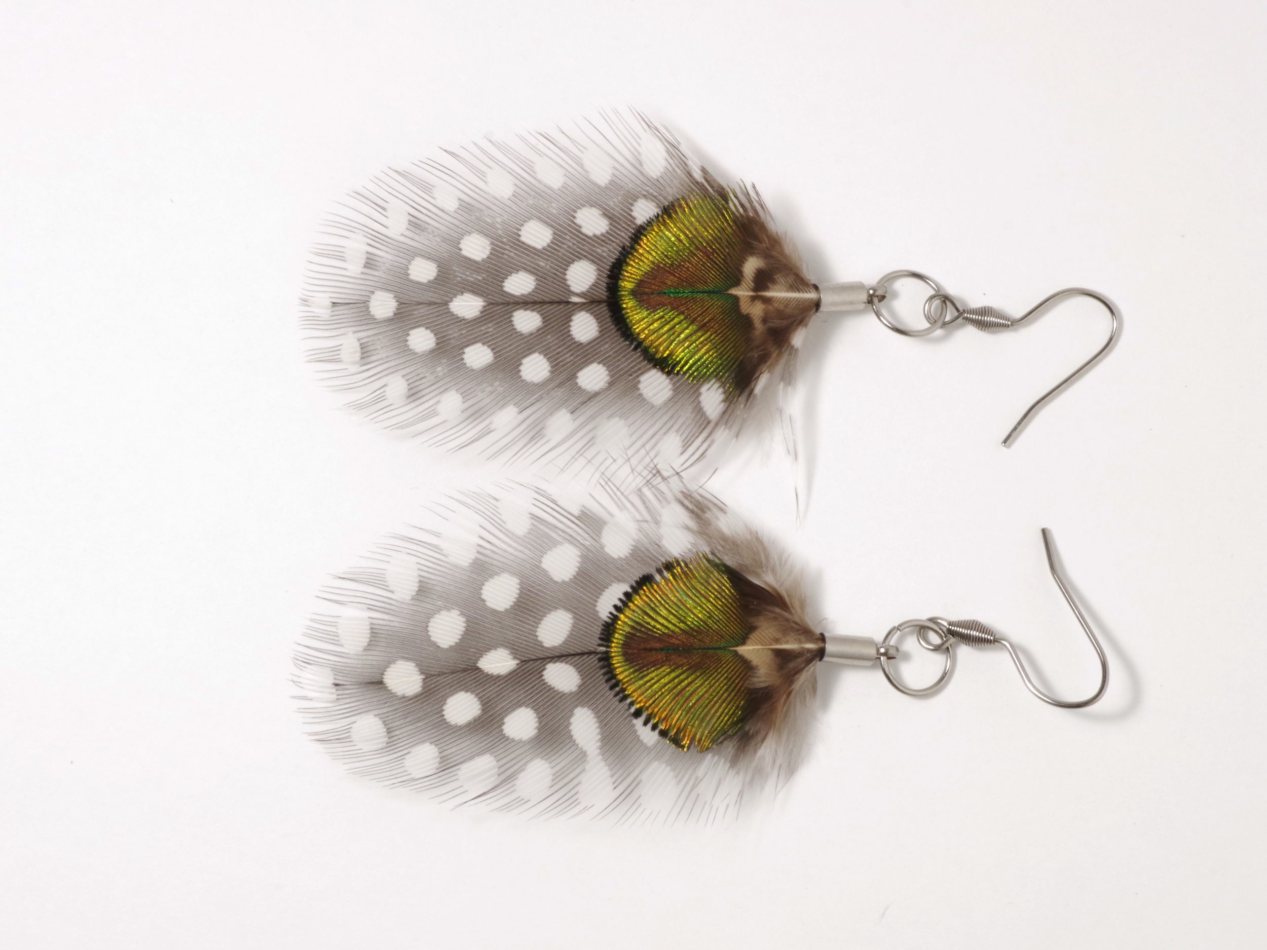 Ces boucles d’oreilles originales ont de belles plumes naturelles dans des tons vert et gris à pois blancs. L’association des deux plumes est à la fois graphique et raffinée, pour un style nature chic.