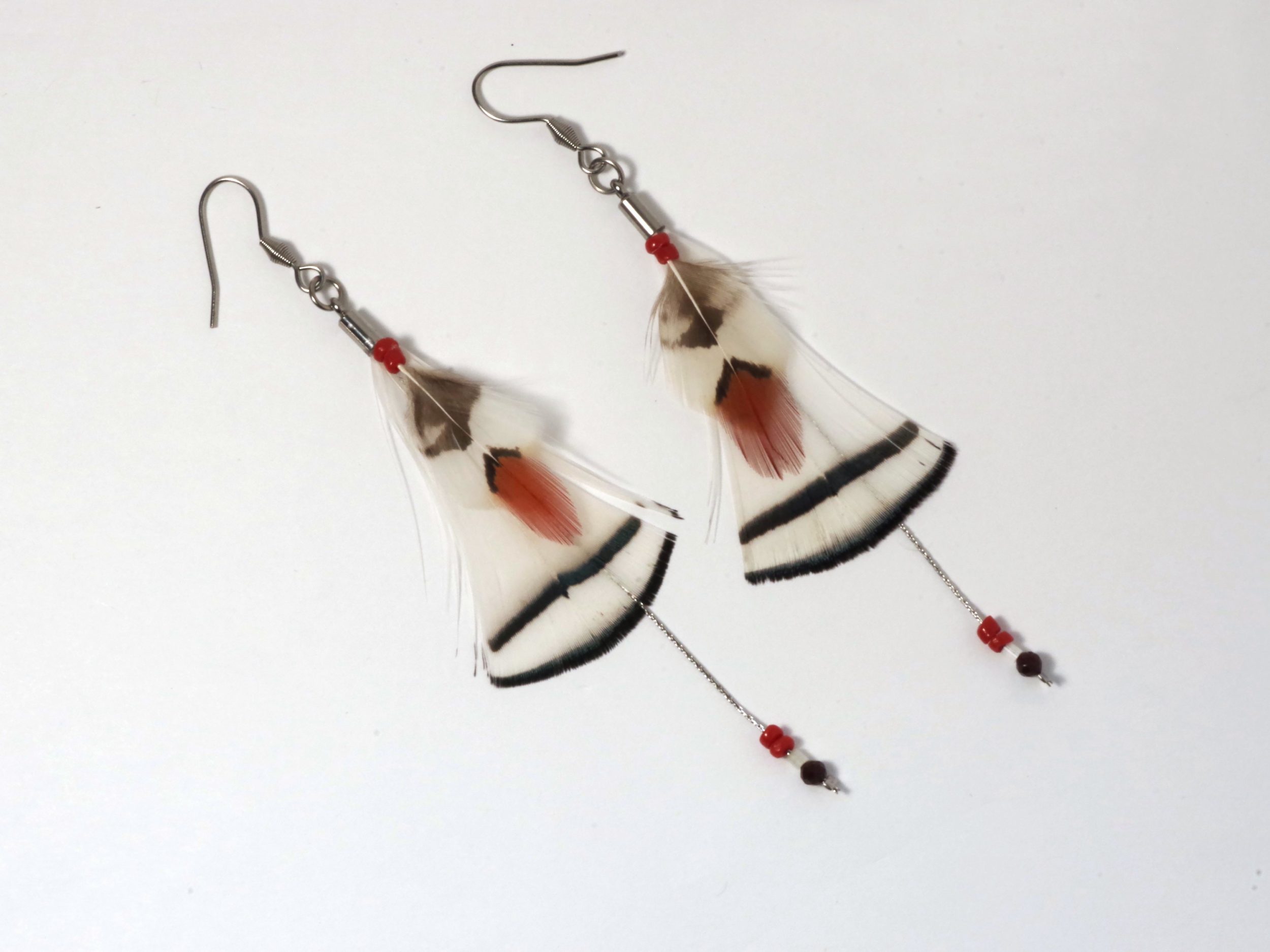 Ces boucles d’oreilles très graphiques sont composées avec des plumes blanches rouge et noir, pour une composition originales, aux couleurs contrastées et gaies. Les plumes sont montées sur une chaîne en inox , accompagnée de petites perles.