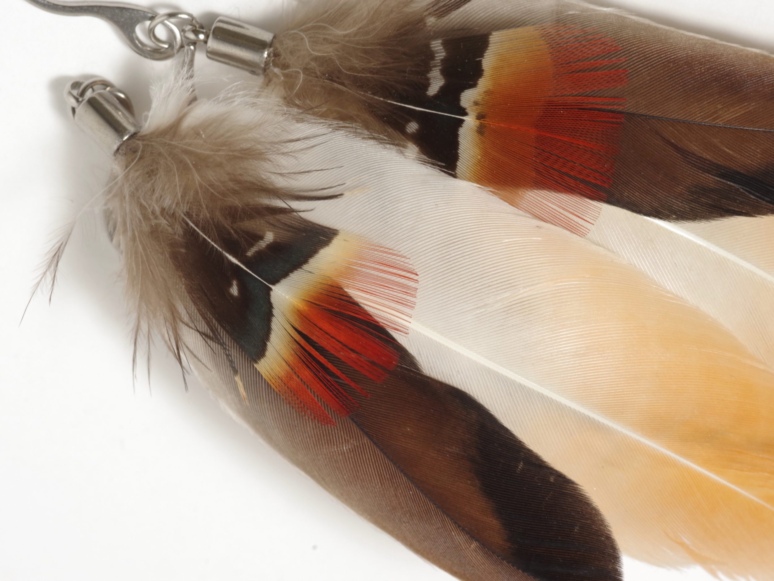 Ces grandes boucles d’oreilles sont réalisées avec des plumes de flamant rose (orange saumon) et des plumes dans des tons brun et rouge. Composition très originale et colorée.