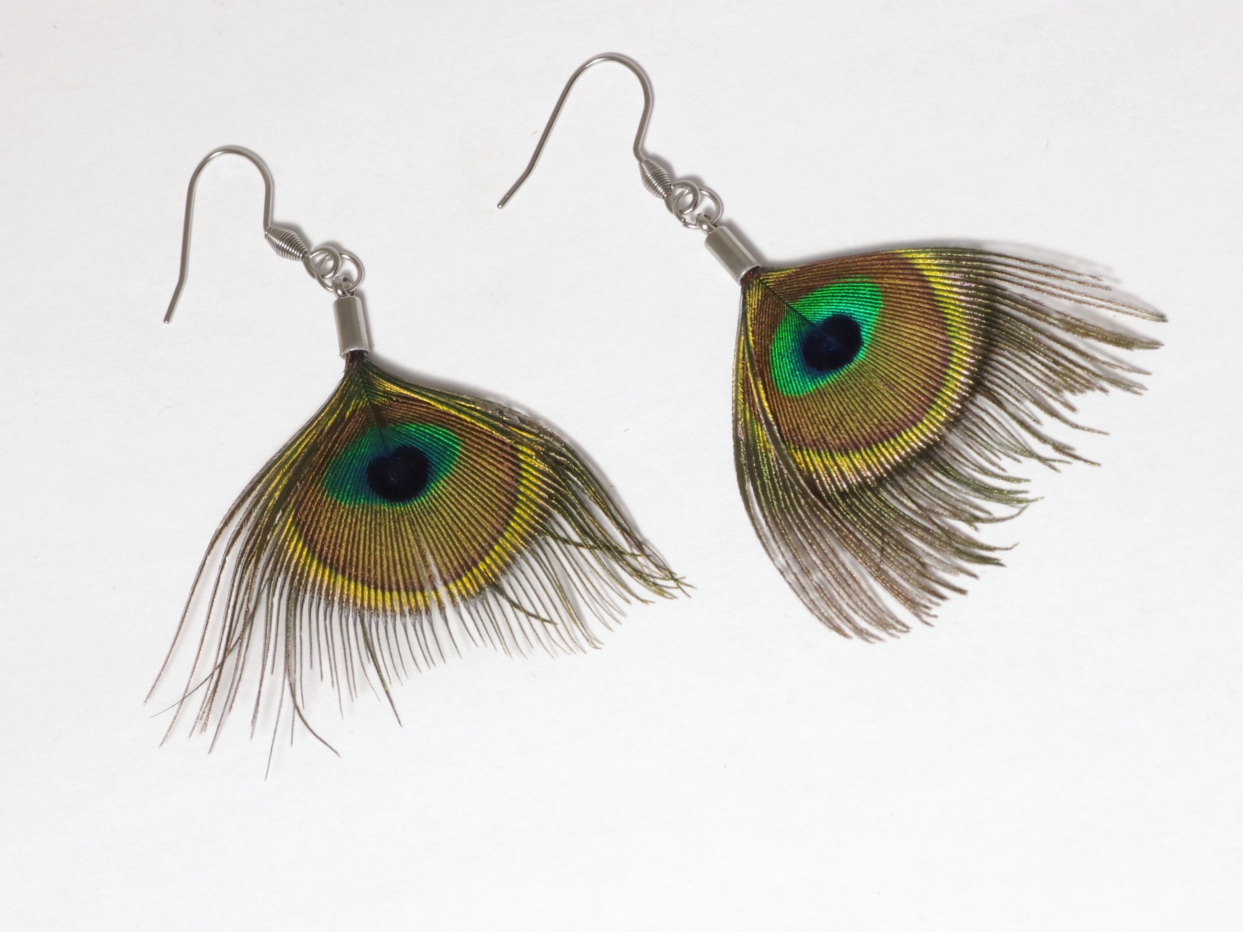 Ces boucles d’oreilles originales ont un tout petit œil de paon. Ce sont des plumes de la roue du paon, comme les grandes plumes habituelles mais en version mini, plus rares.