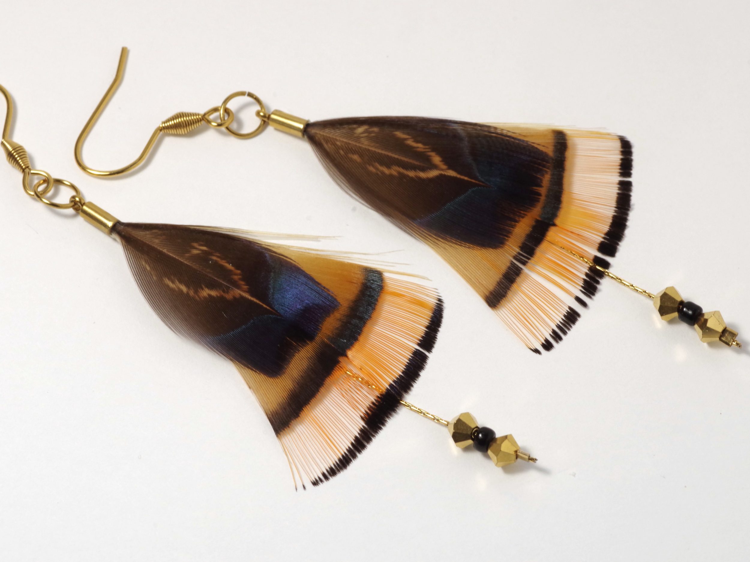 Je joins aux boucles d’oreilles une fiche d’explication pour l’origine des plumes et les conseils d’entretien.