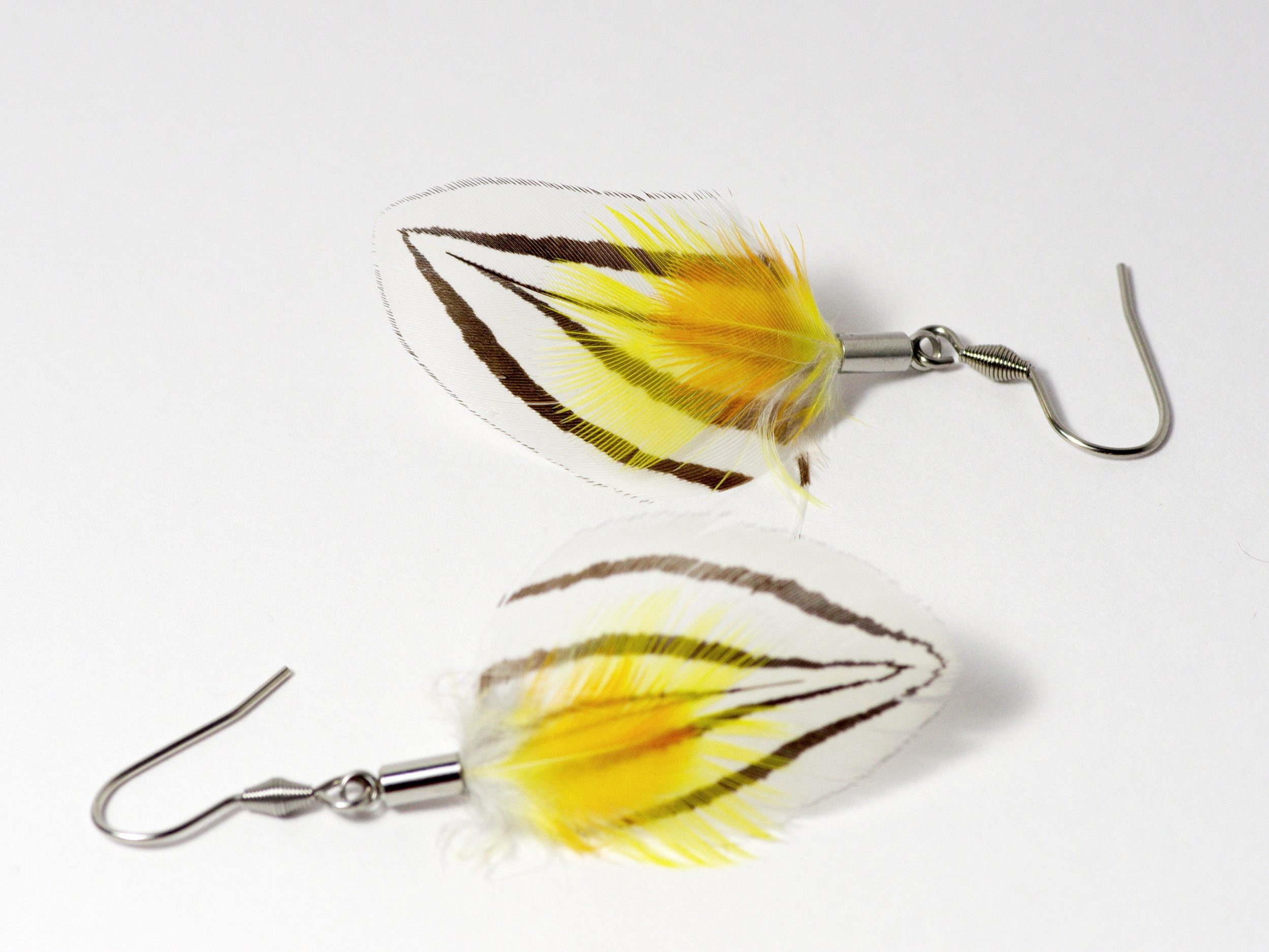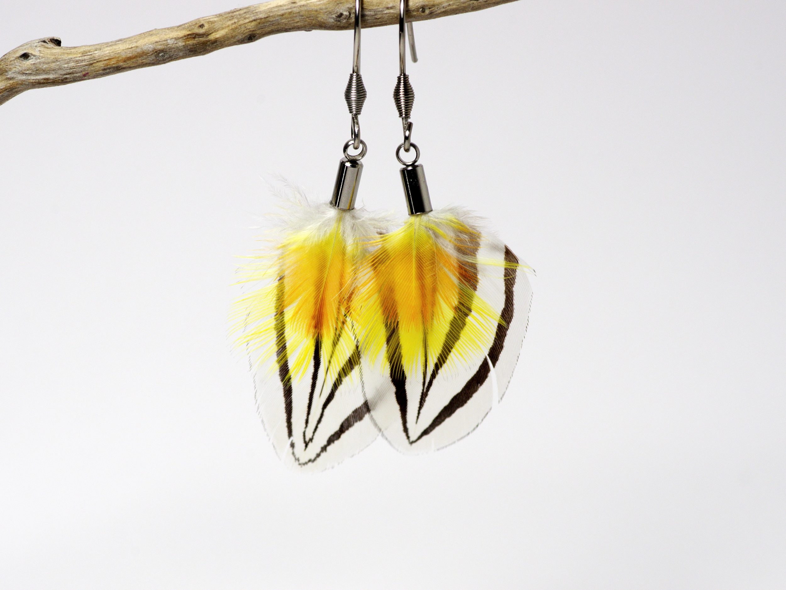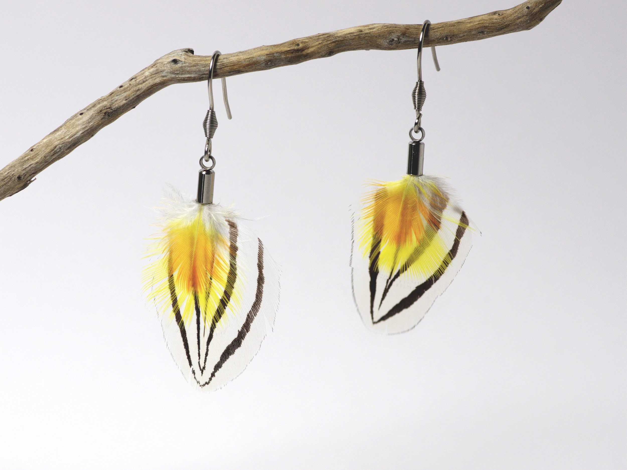 Ces  boucles d’oreilles  sont réalisées avec une composition originale et très contrastée : des plumes blanches noires et jaunes.