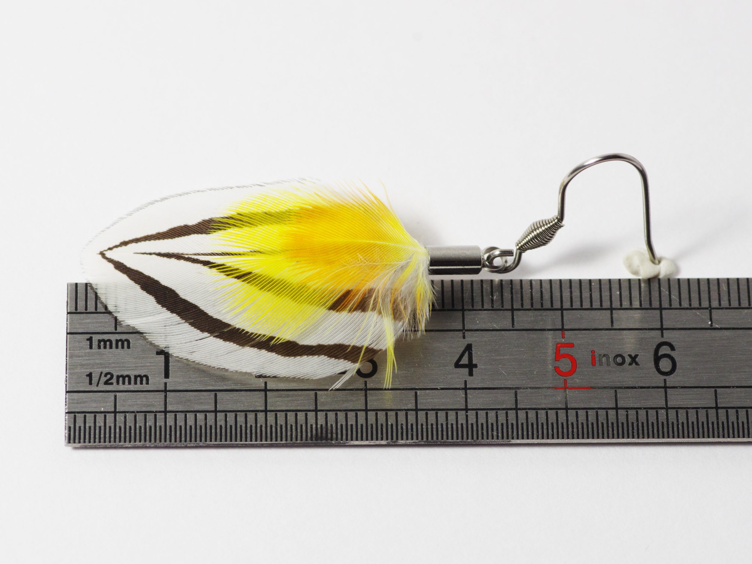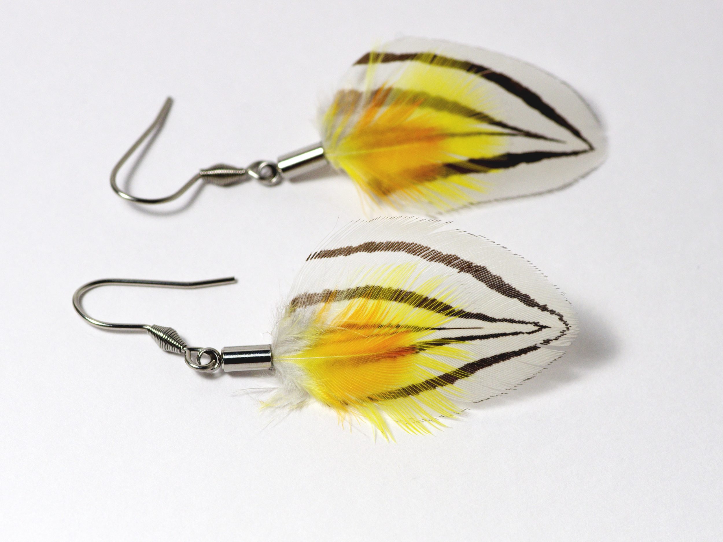C’est une variante de la paire de boucles d’oreilles Phoenix aux plumes d’un rouge éclatant. Celle-ci a des plumes jaunes.