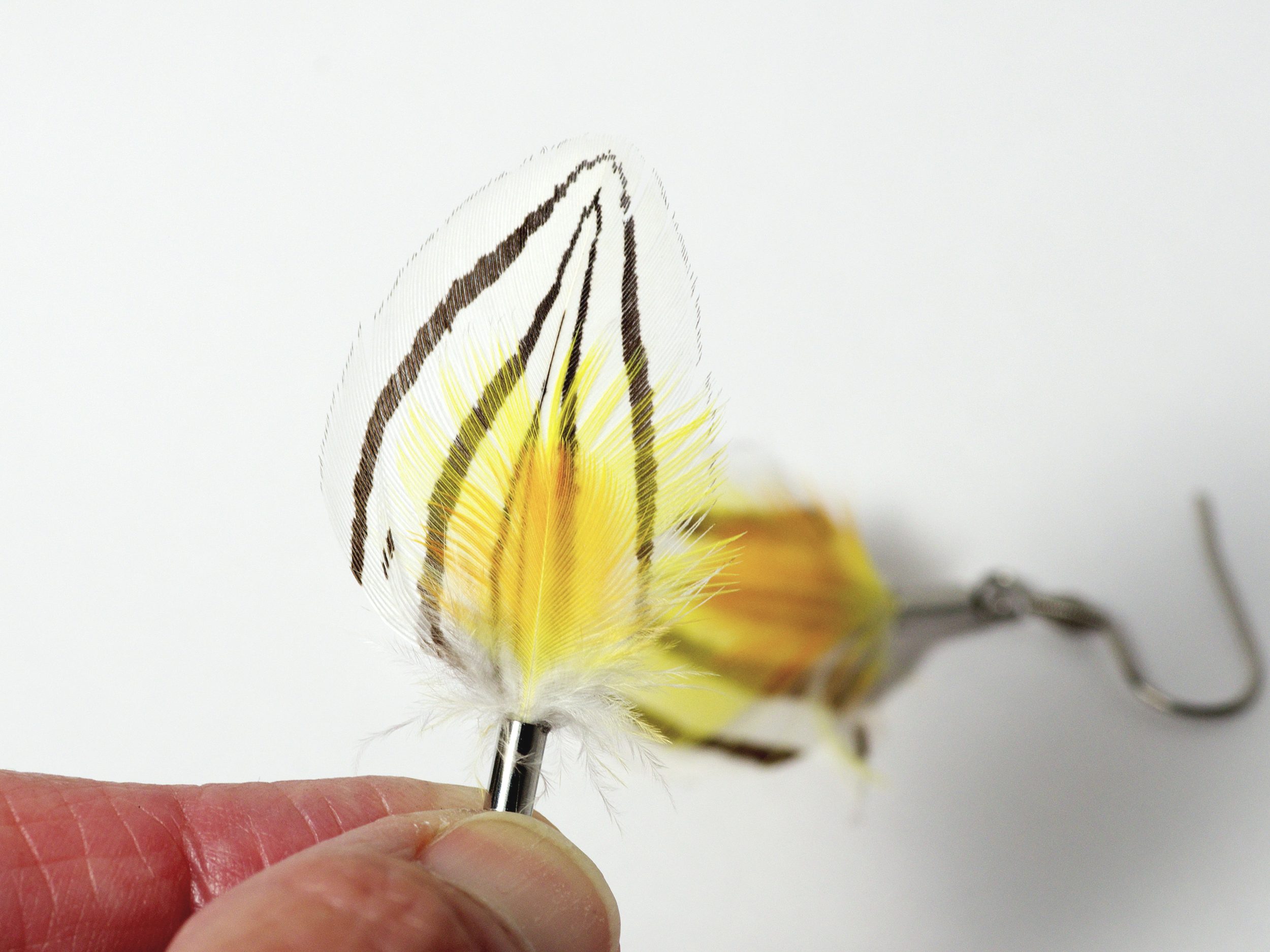 Composition de plumes aux couleurs naturelles très contrastées : l’une blanche avec des fins chevrons noirs , une autre jaune citron, et une troisième venant nuancer le jaune d’une touche un peu plus chaude jaune-orangé.