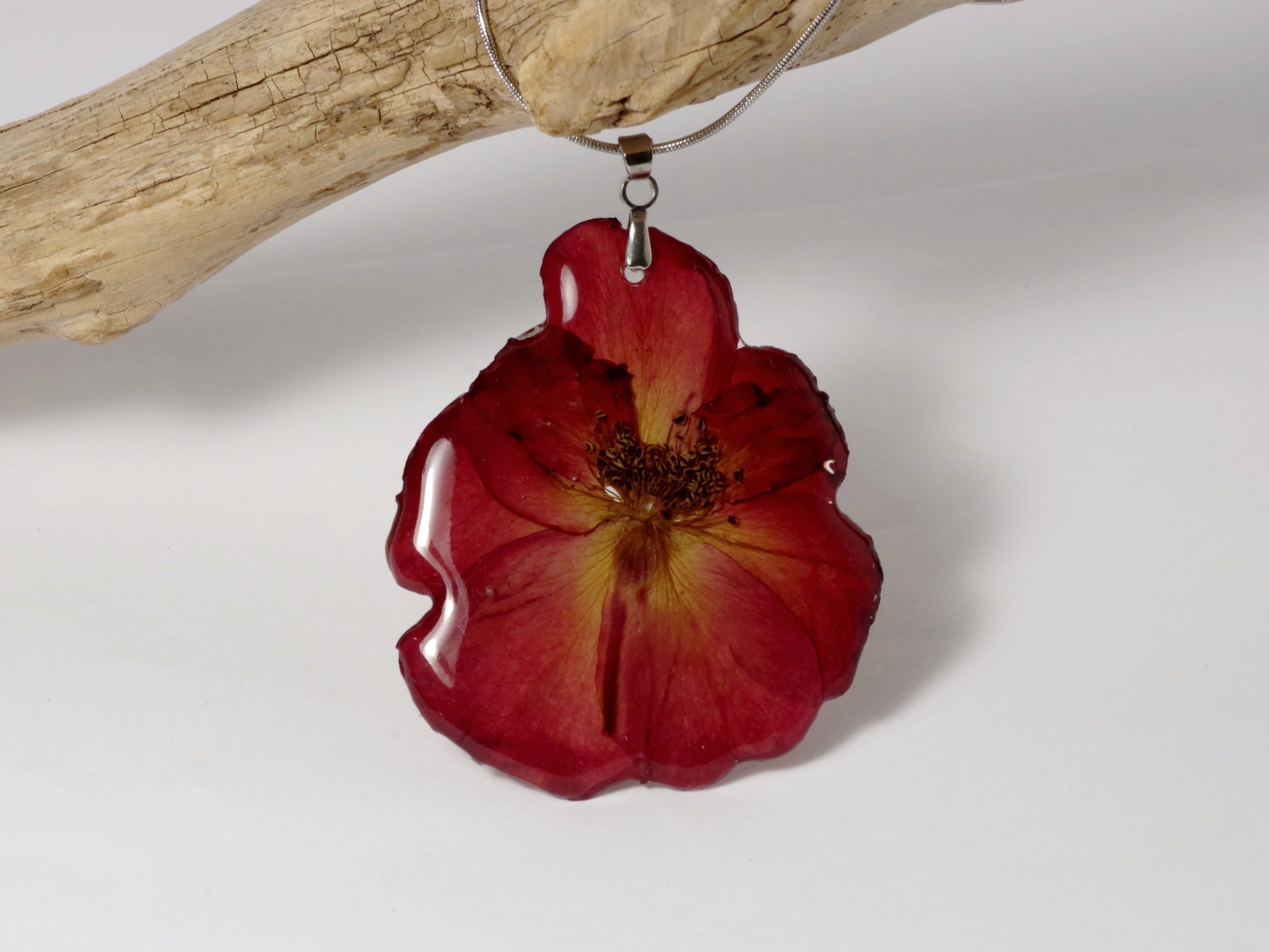 Pendentif vraie rose rouge cristallisée, c’est une rose de mon jardin protégée par de la résine transparente.