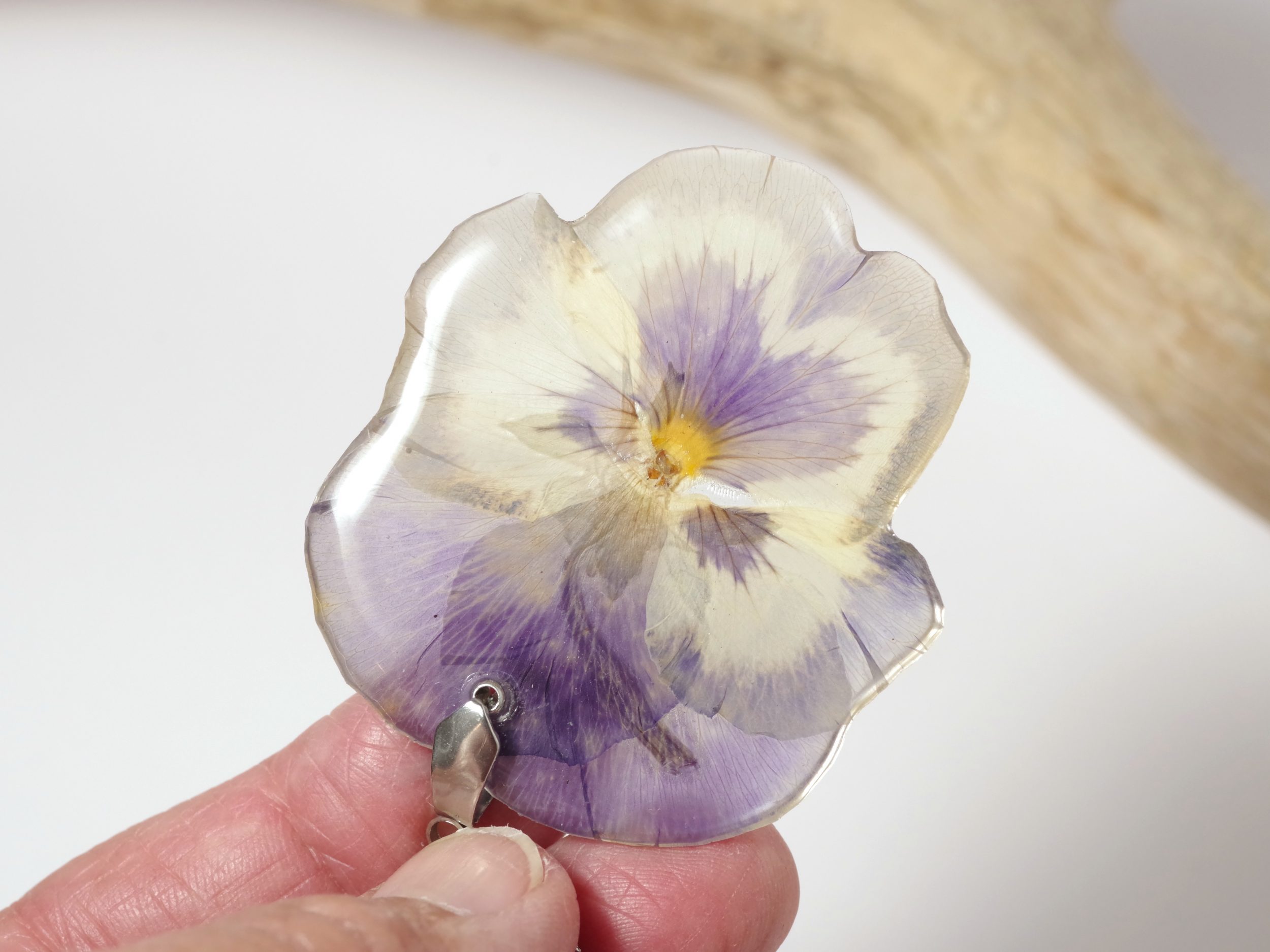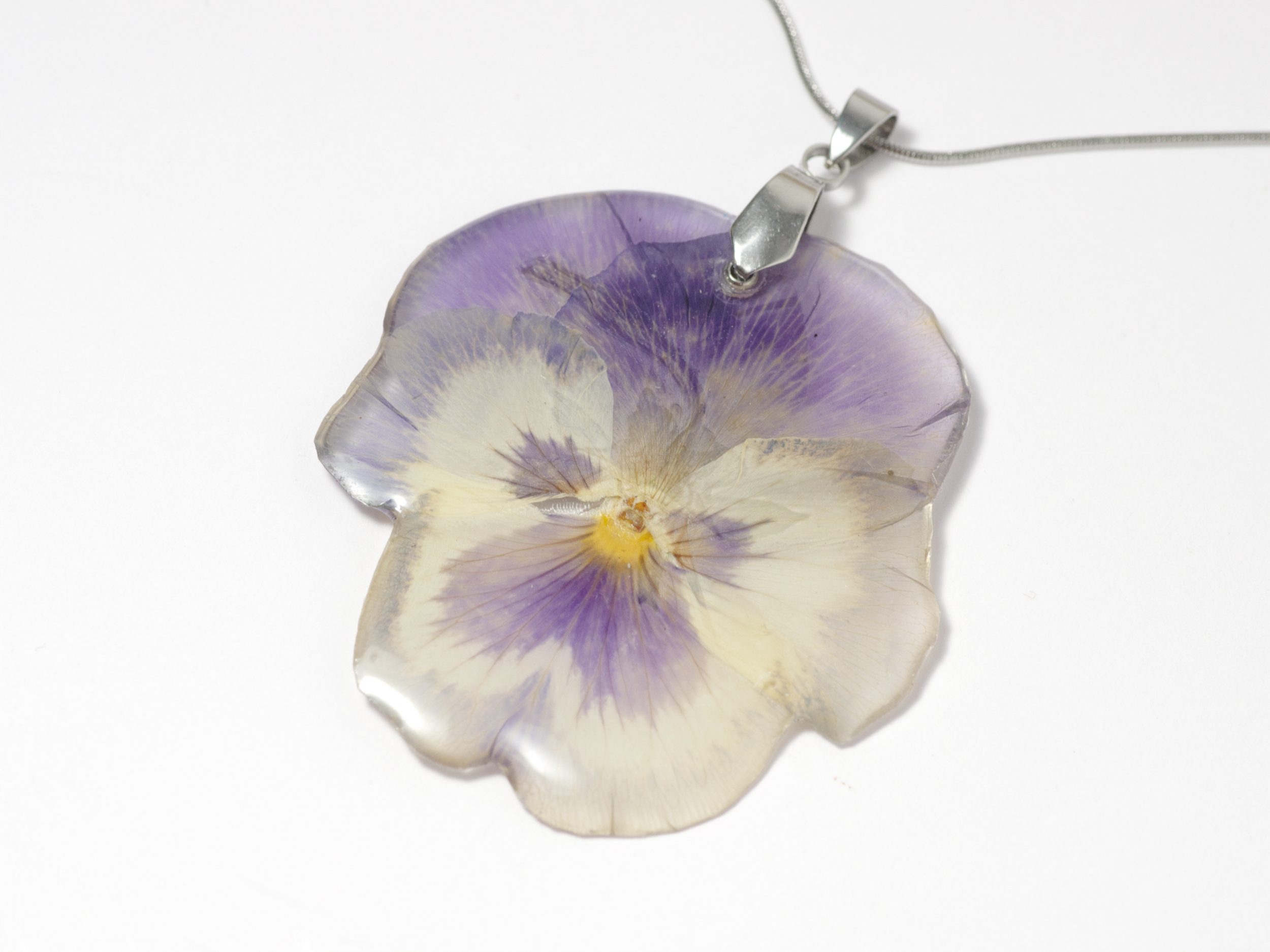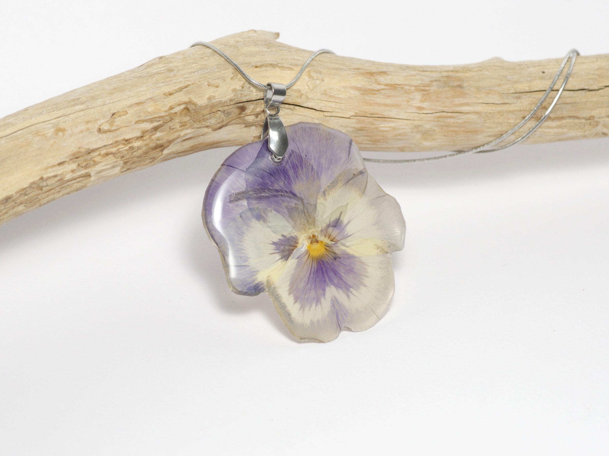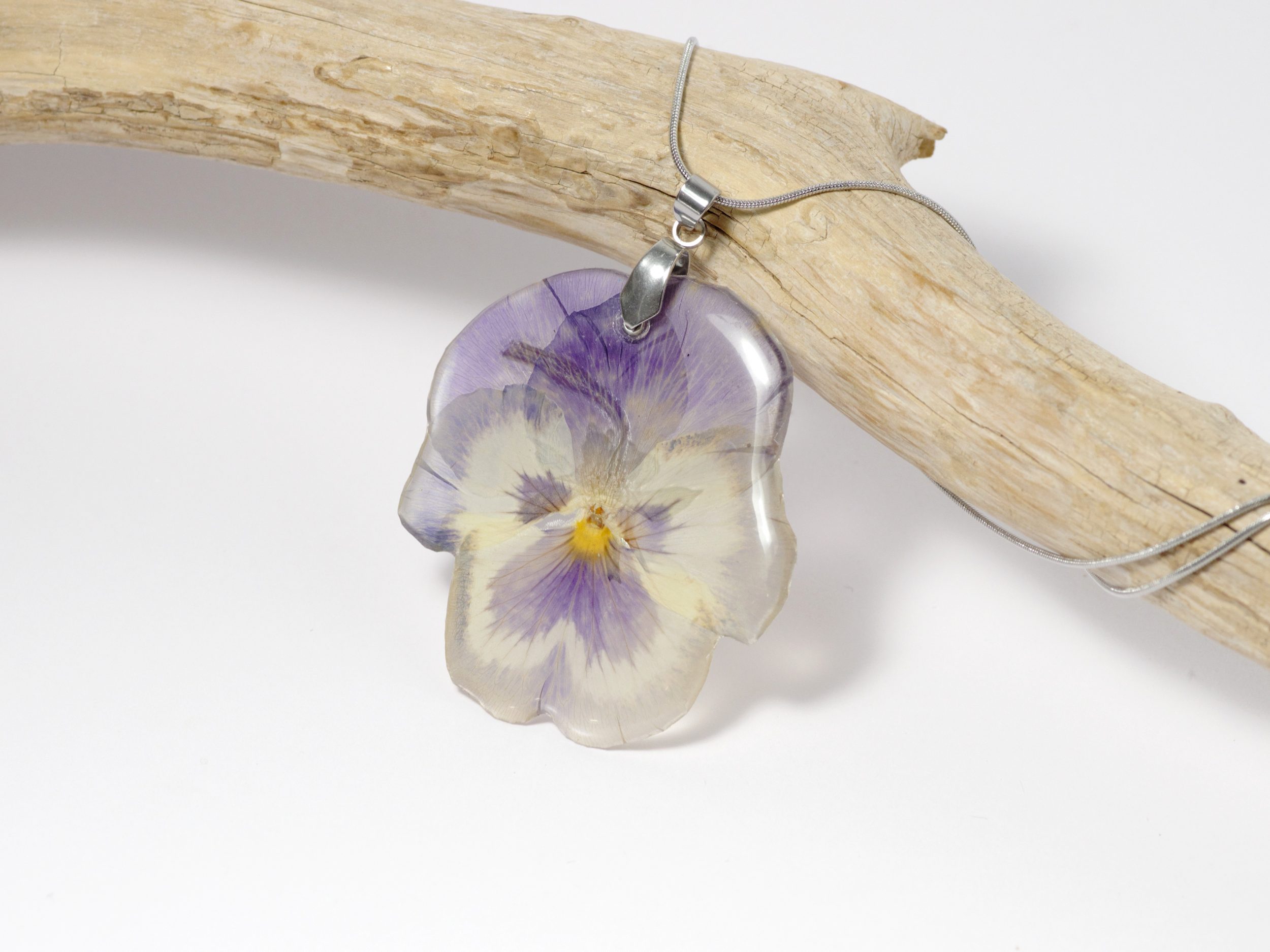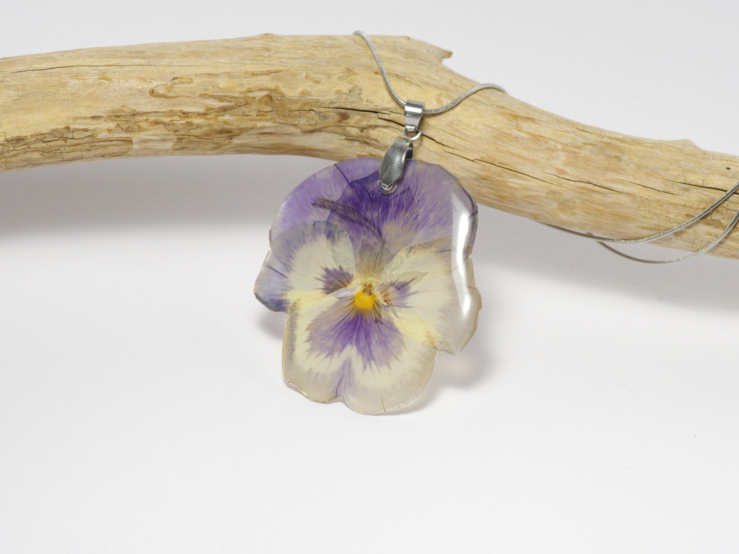 0Le pendentif de ce collier Elfine est une vraie fleur de pensée glacée à la résine. Elle est violette avec des nuances claires et foncées, et un peu de jaune.
