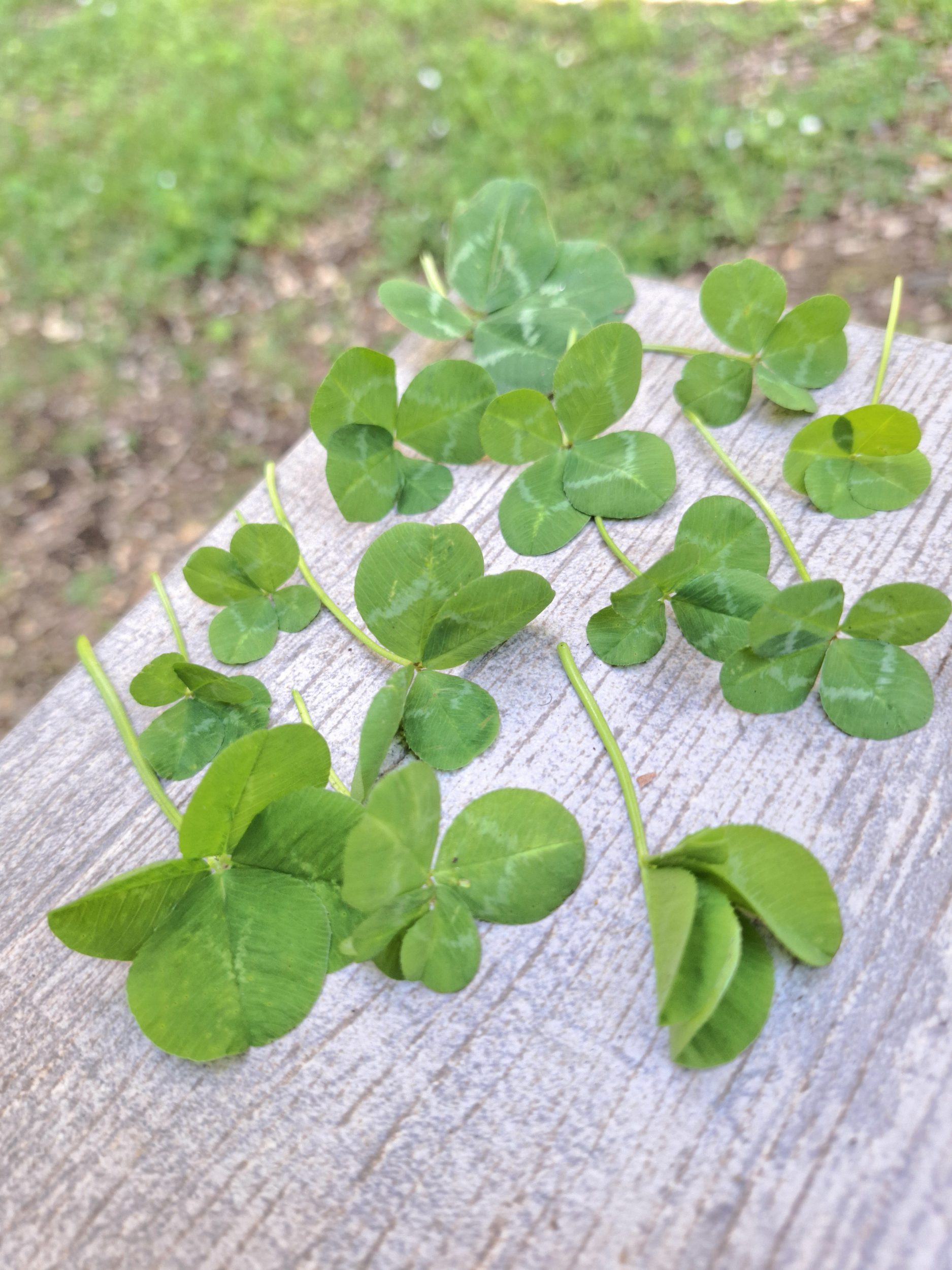 J’ai la chance d’avoir des pieds mutants dans mon jardin, donc je trouve de temps en temps des trèfles à quatre feuilles.