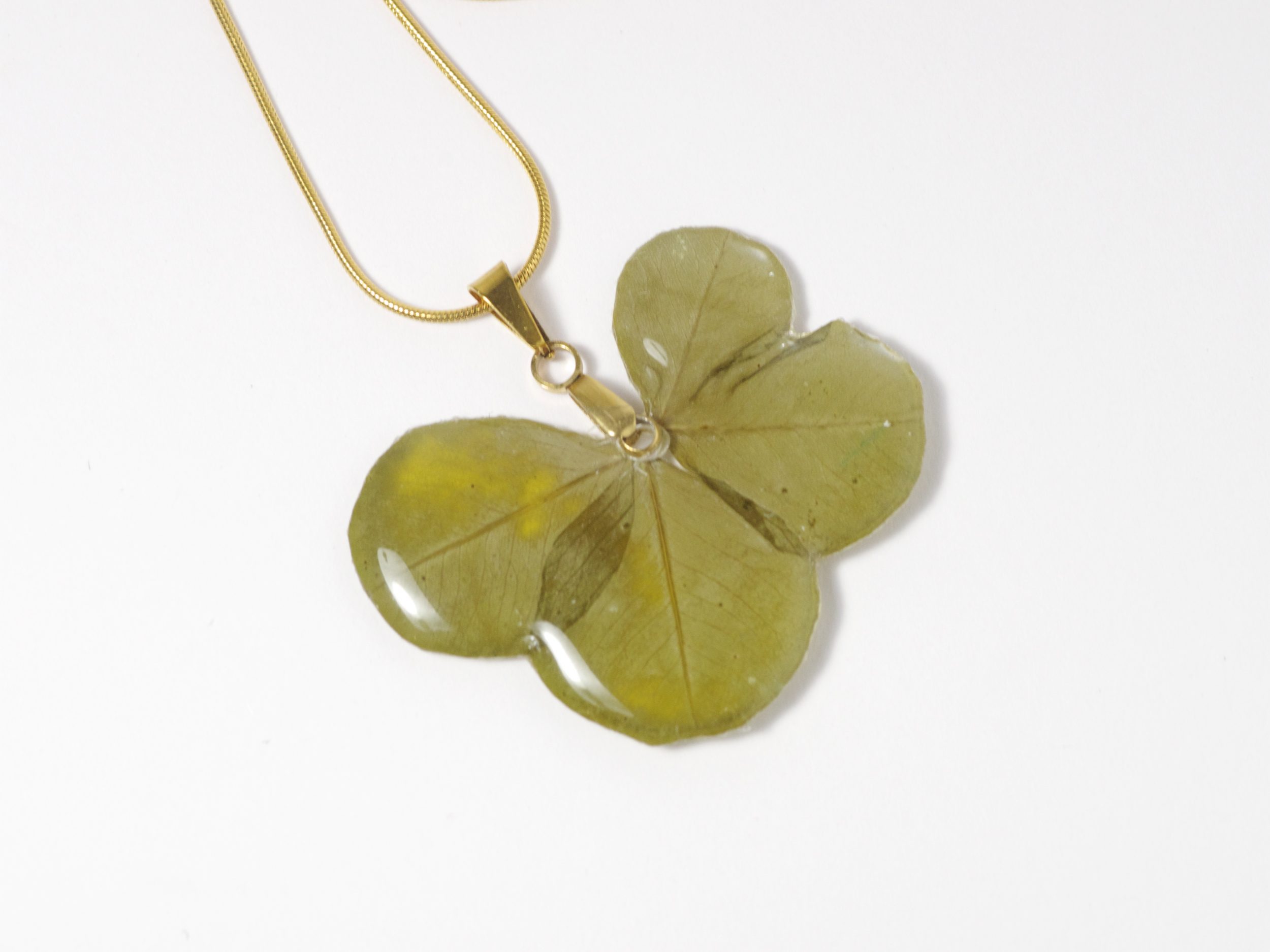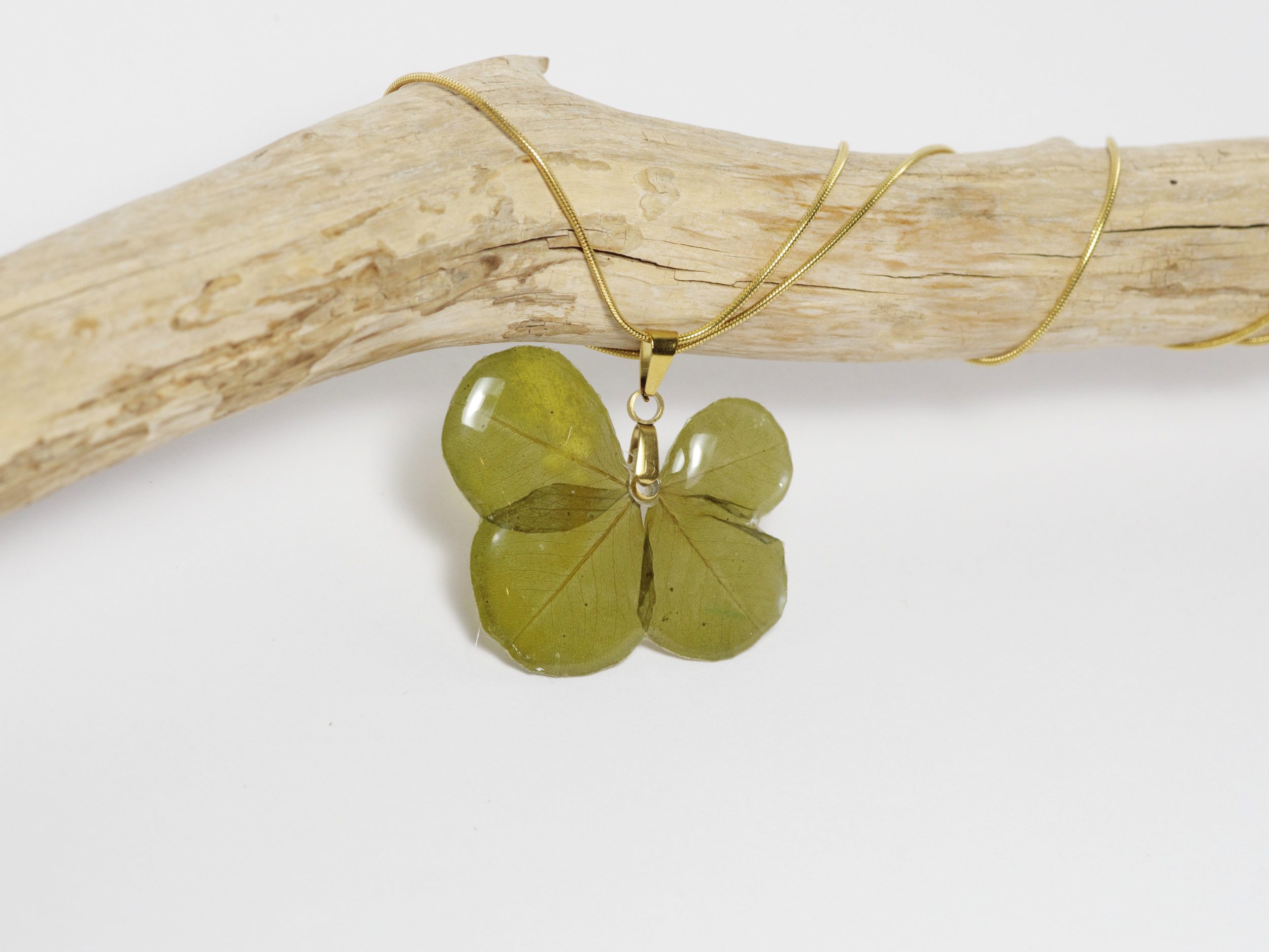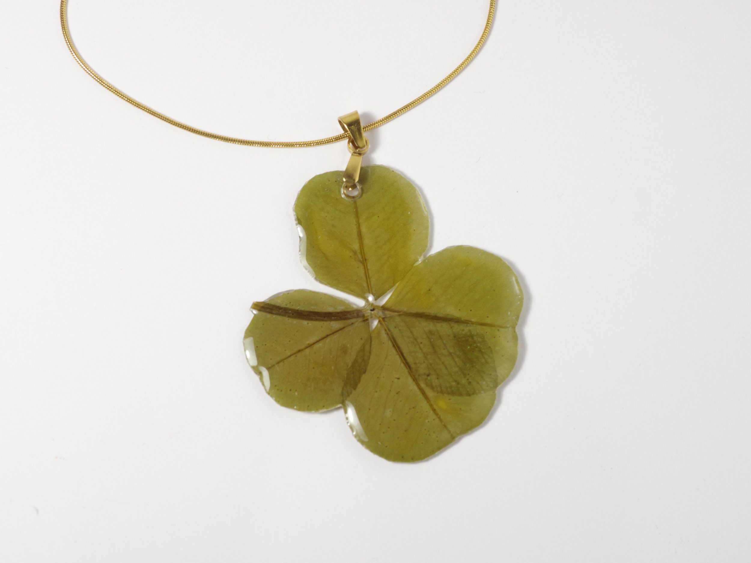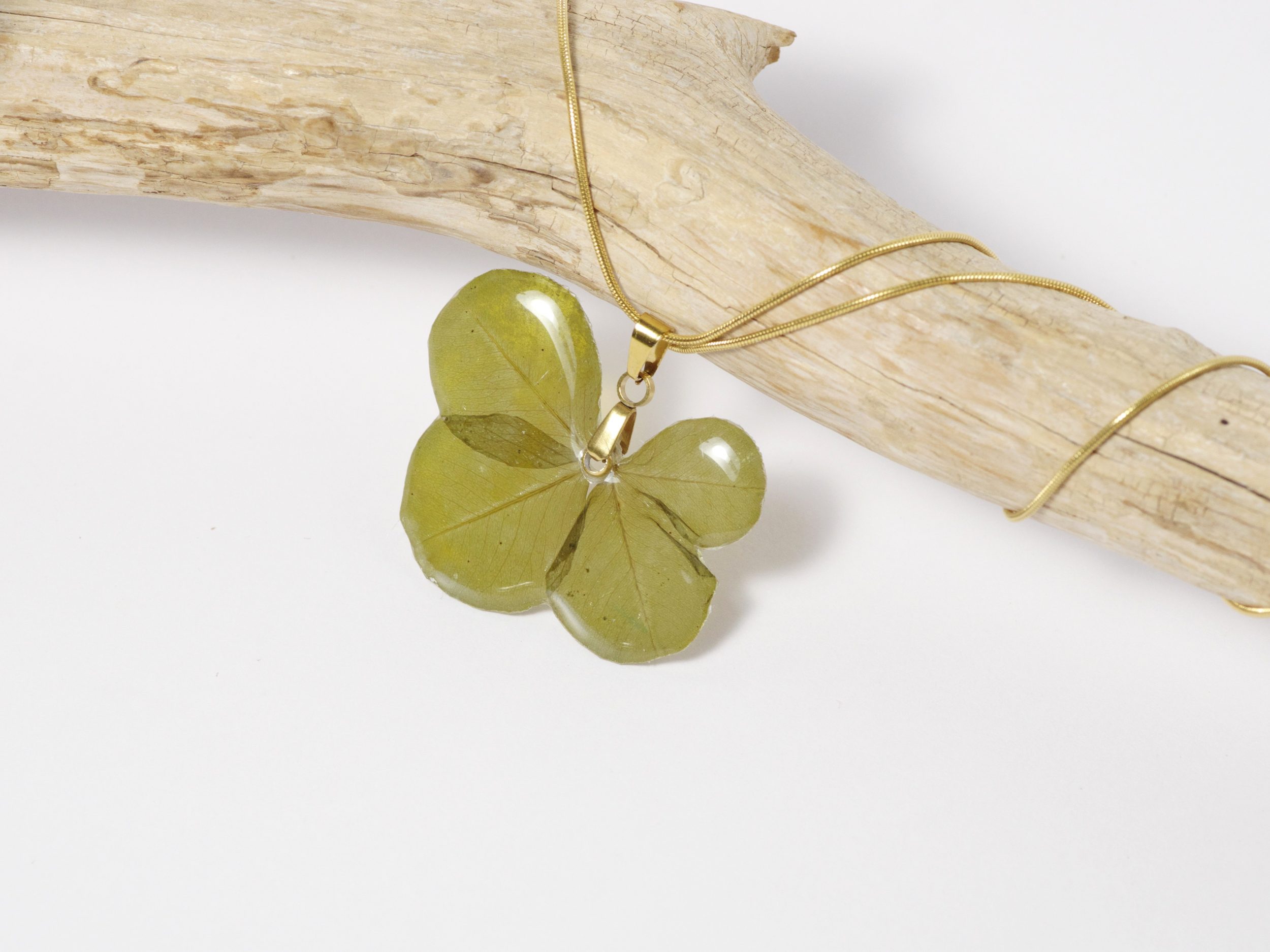 Collier Elfine avec en pendentif un vrai trèfle à quatre feuilles glacé à la résine. Vous avez le choix entre plusieurs trèfles.