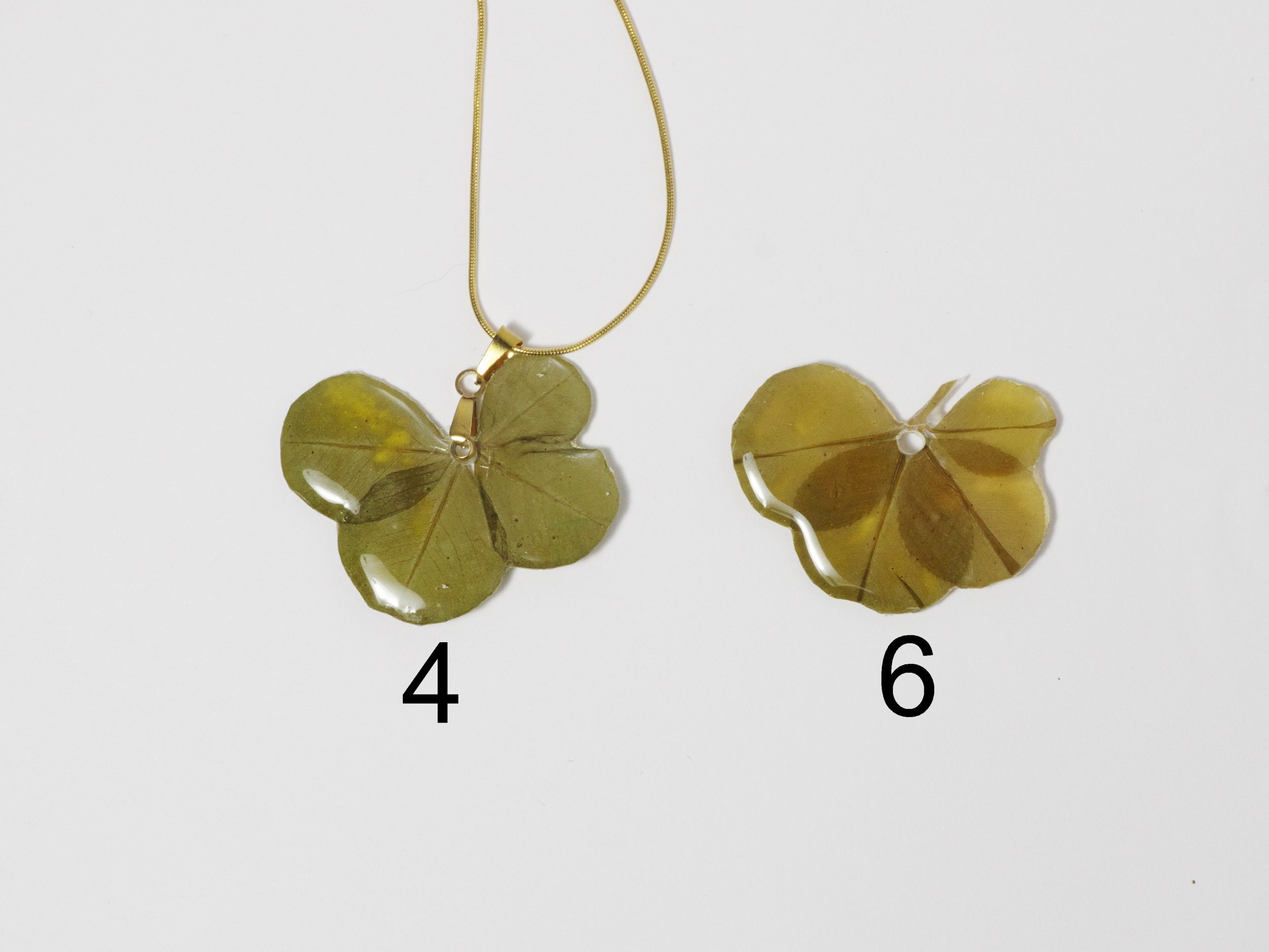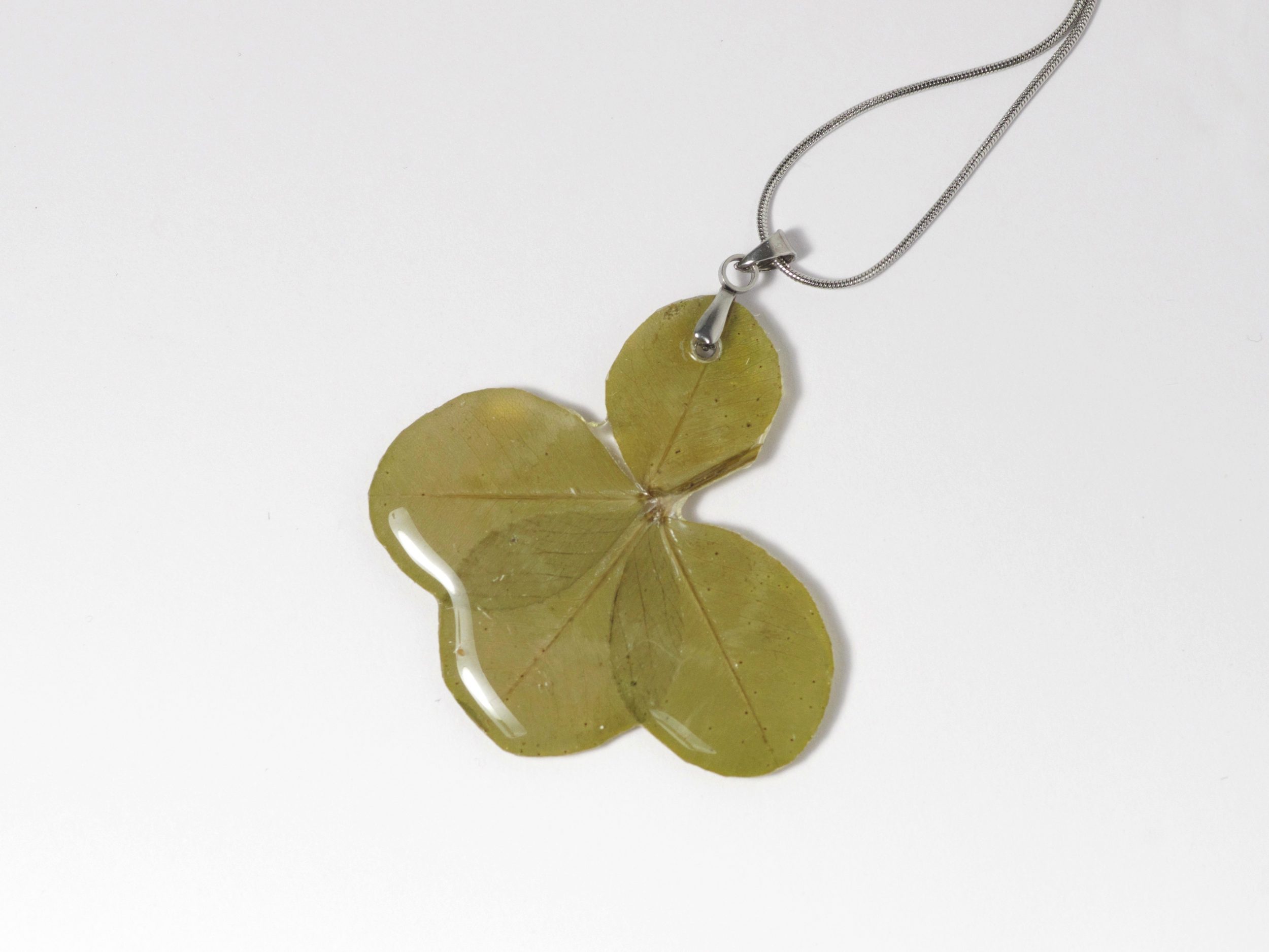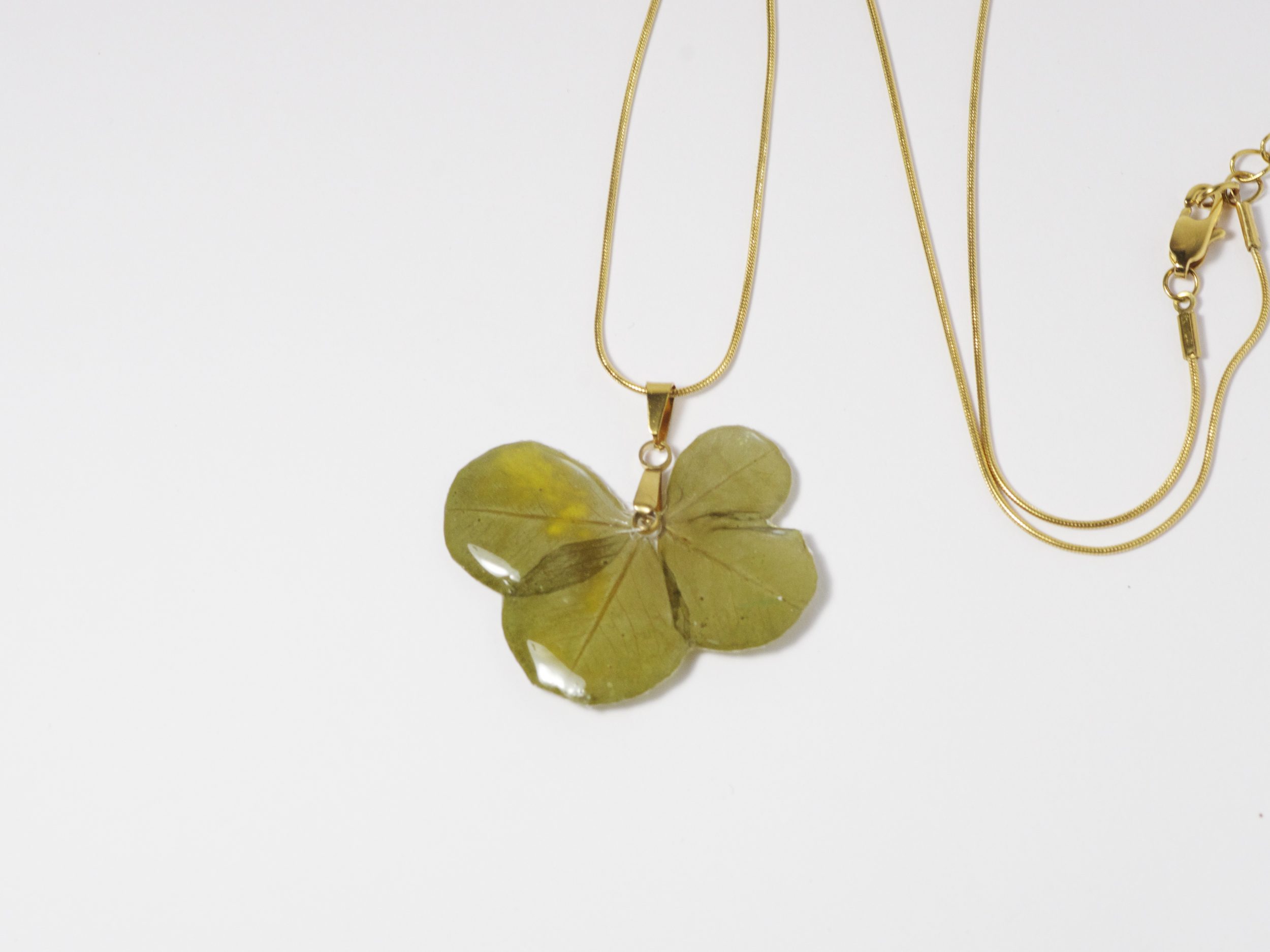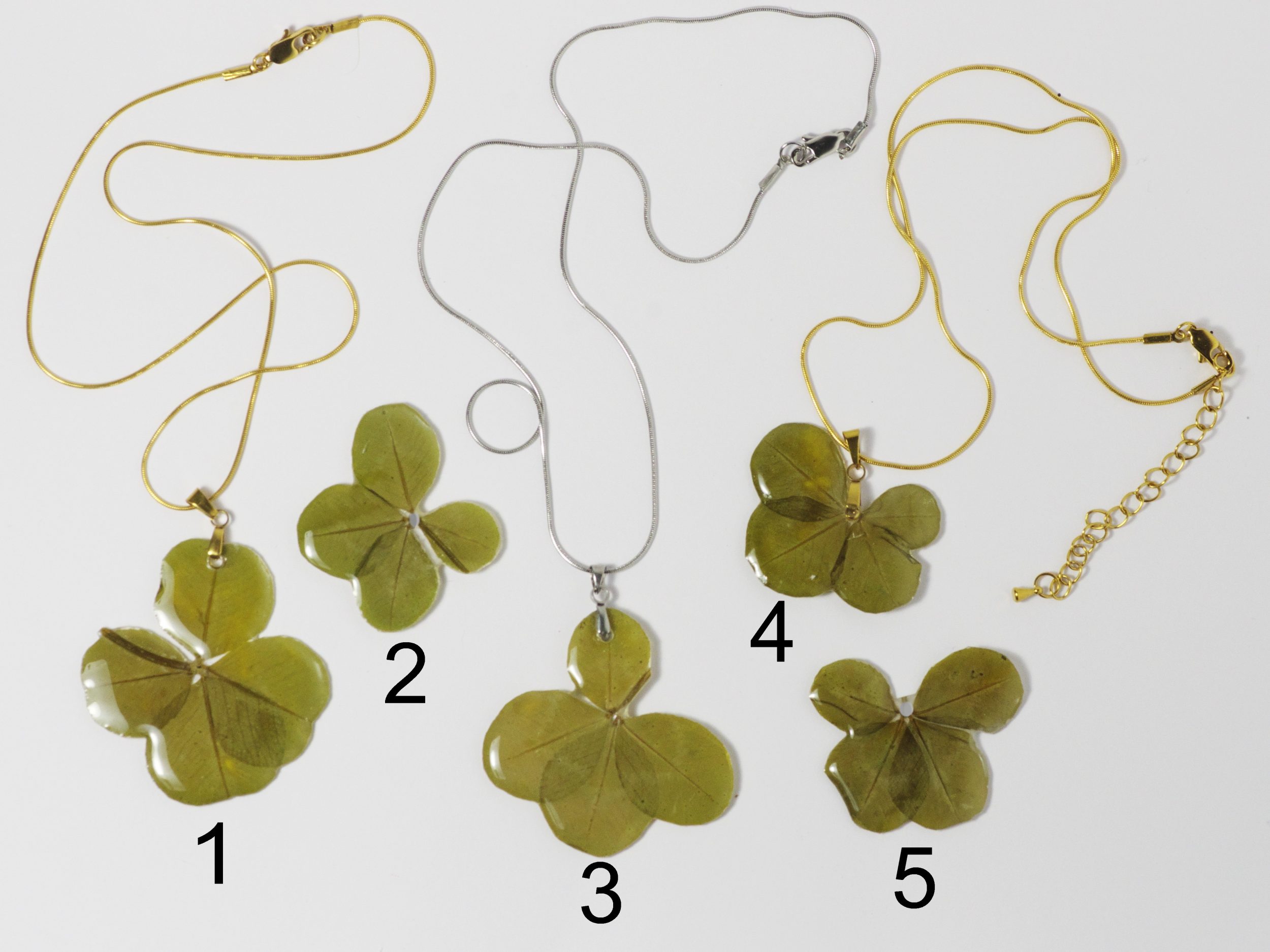 Collier Elfine avec en pendentif un vrai trèfle à quatre feuilles glacé à la résine. Vous avez le choix entre plusieurs trèfles.