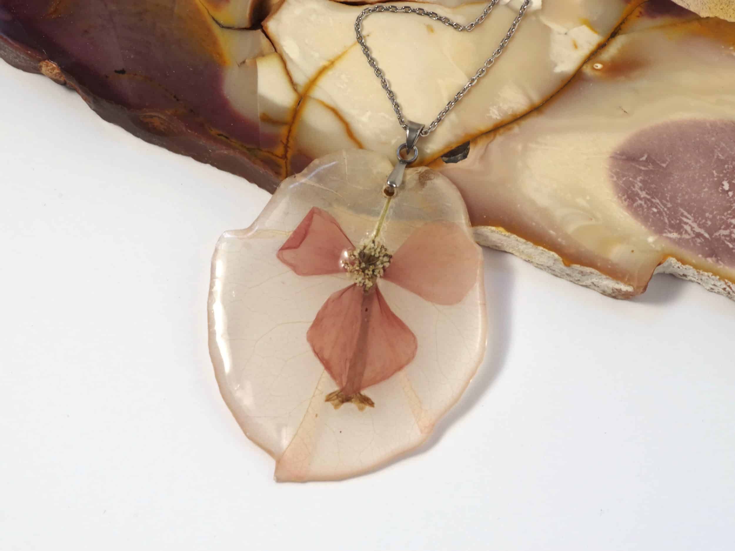 J’ai protégé la composition florale avec du plastique à chaud, puis j’ai résiné les deux faces du pendentif.