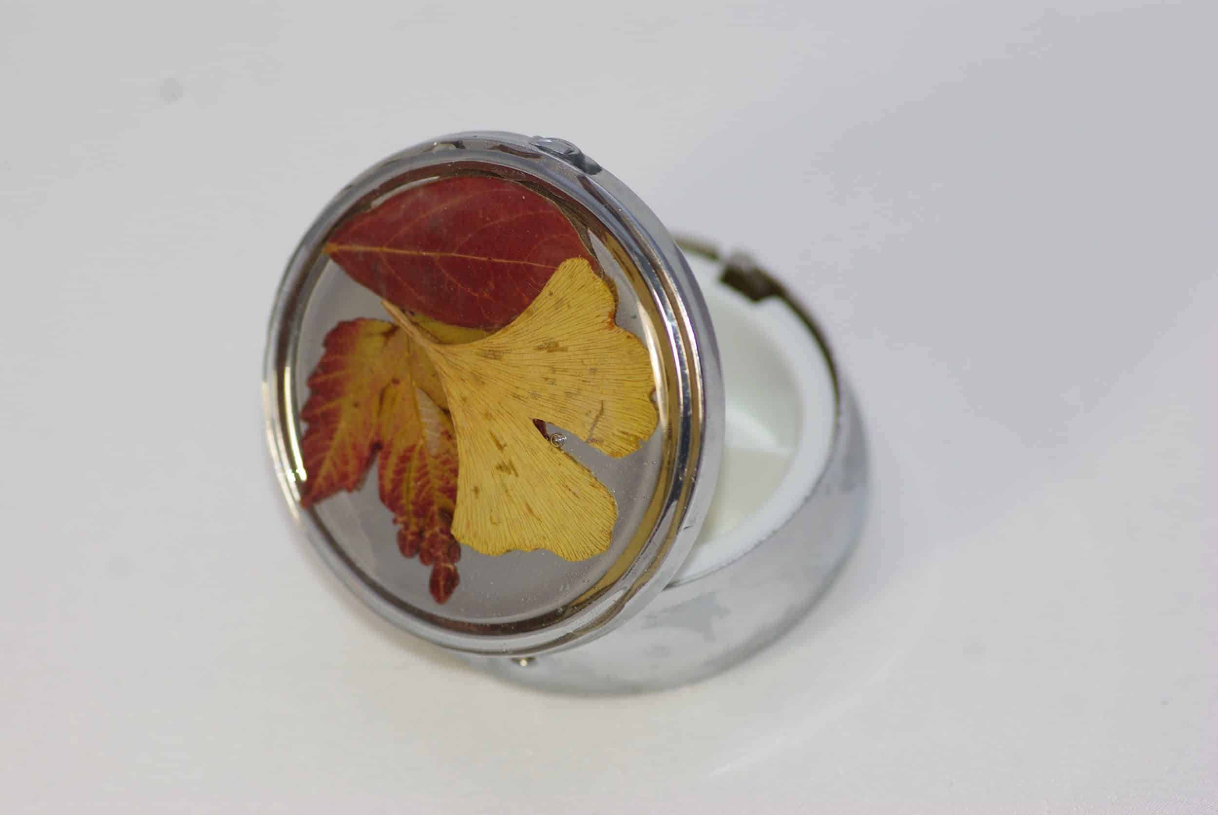 Voici un très joli accessoire de sac, une grande boite à pilules ronde : décorée de feuilles d’automne séchées en inclusion dans de la résine.