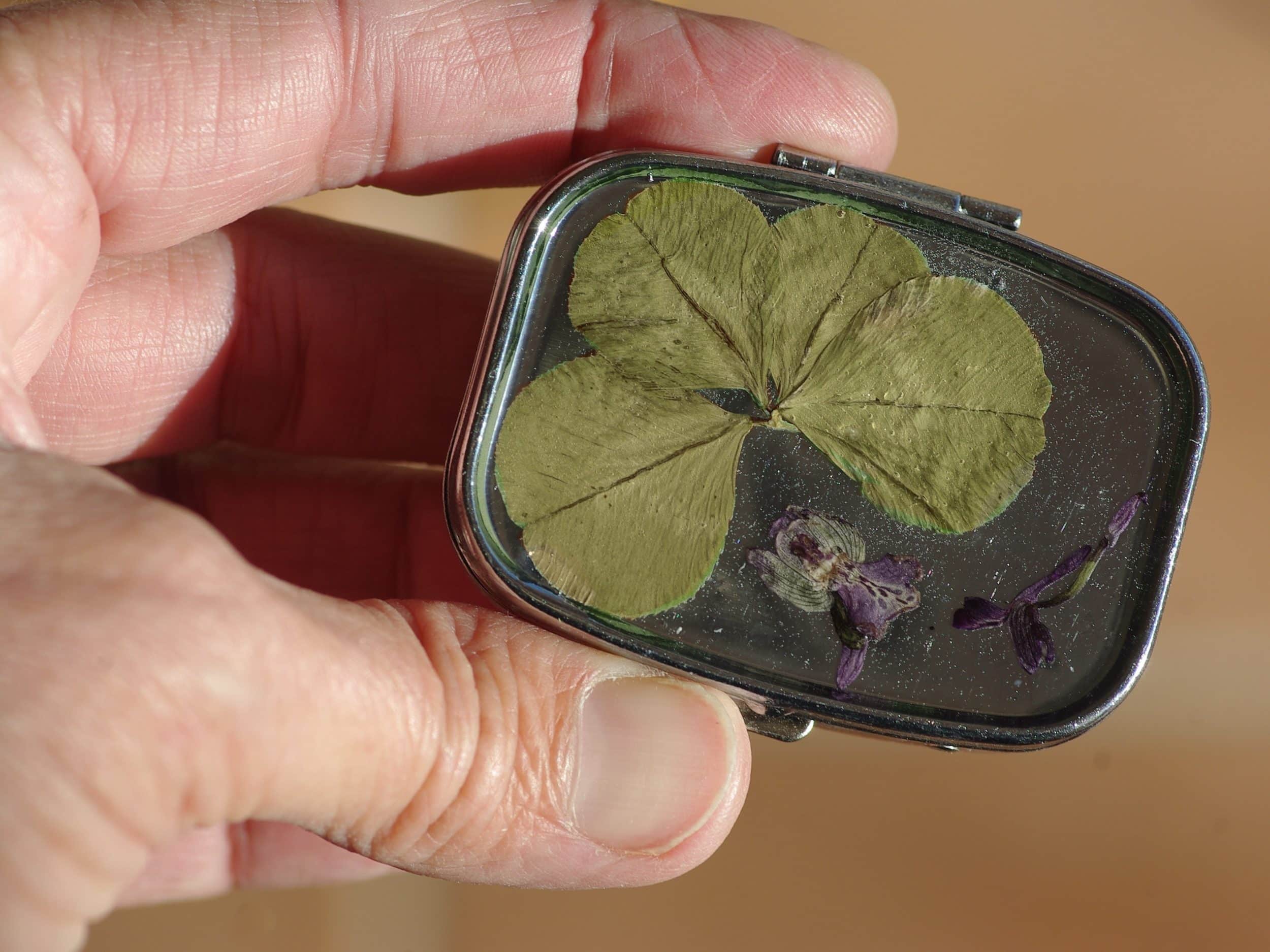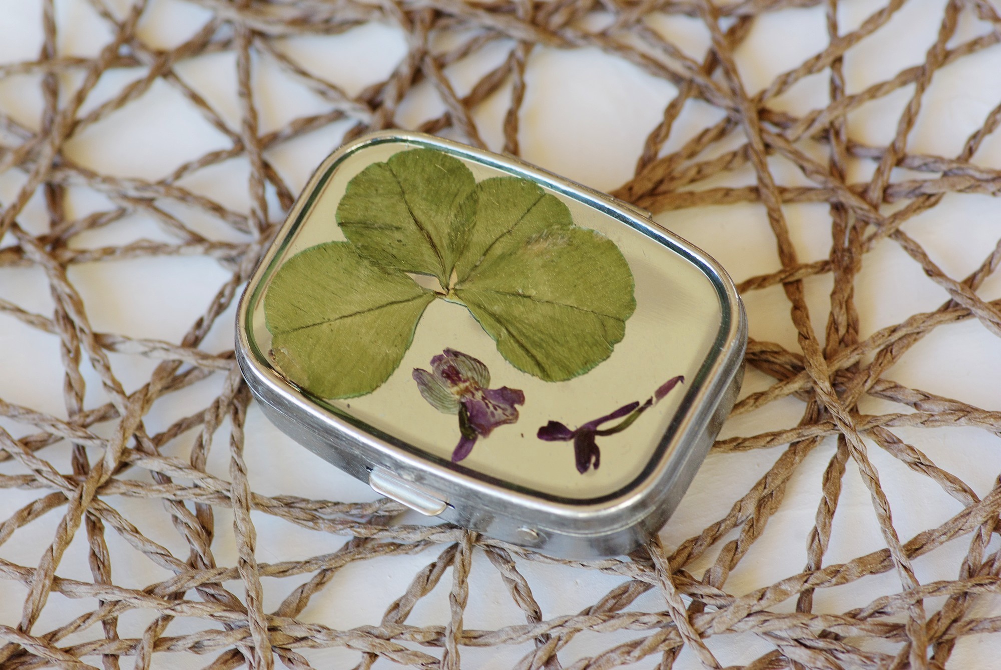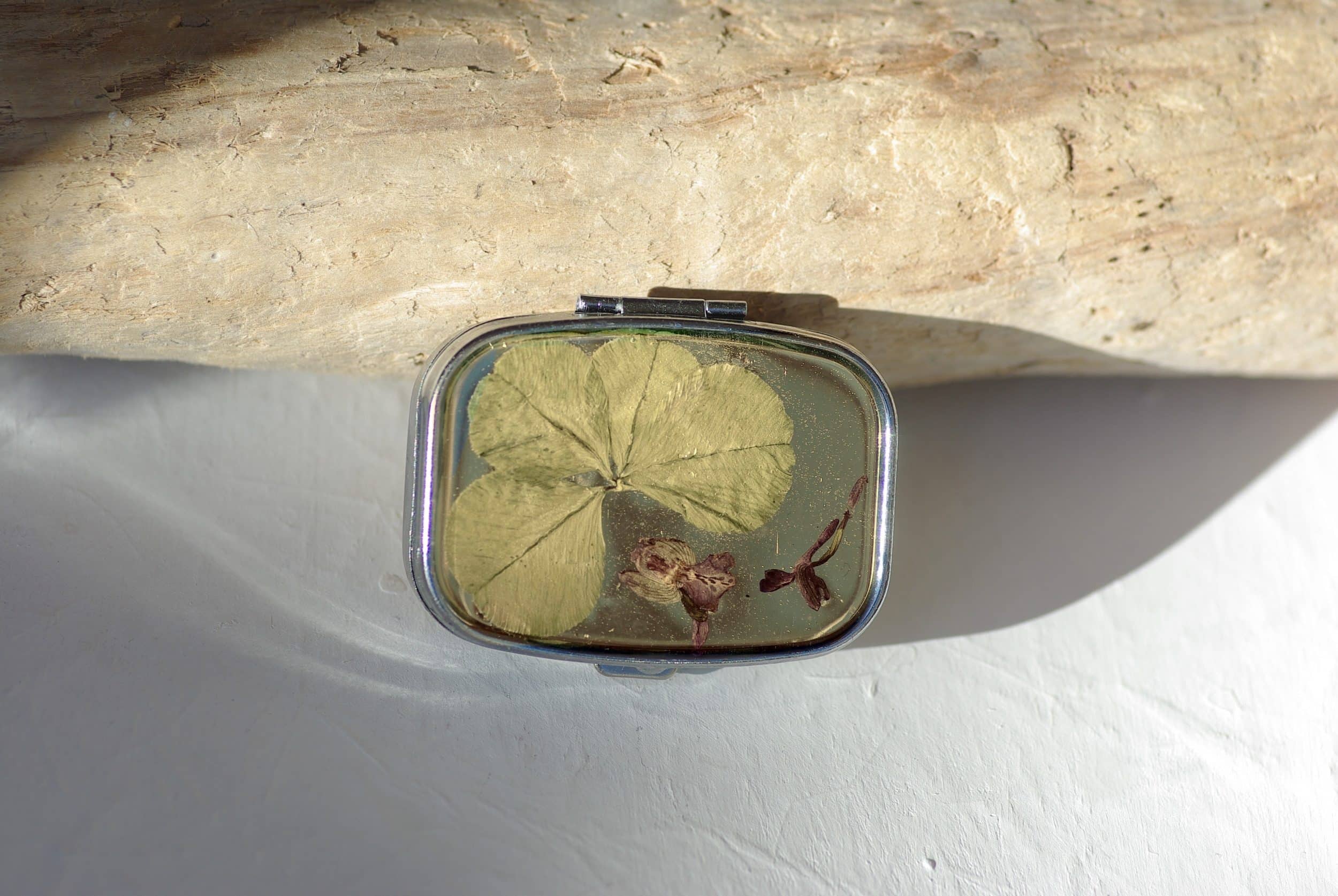 Voici un très joli accessoire de sac, un petit pilulier décoré d’un vrai trèfle à quatre feuilles séché en inclusion dans de la résine.